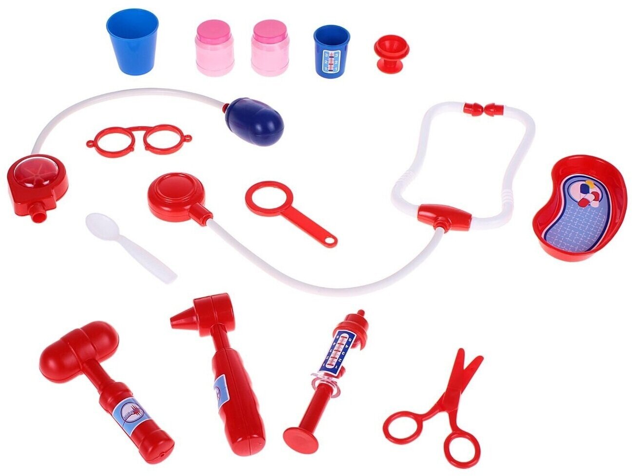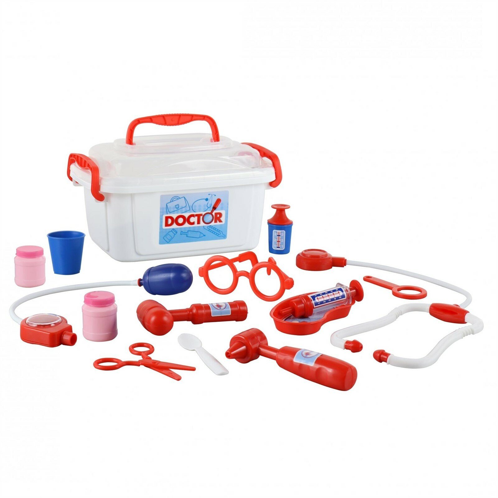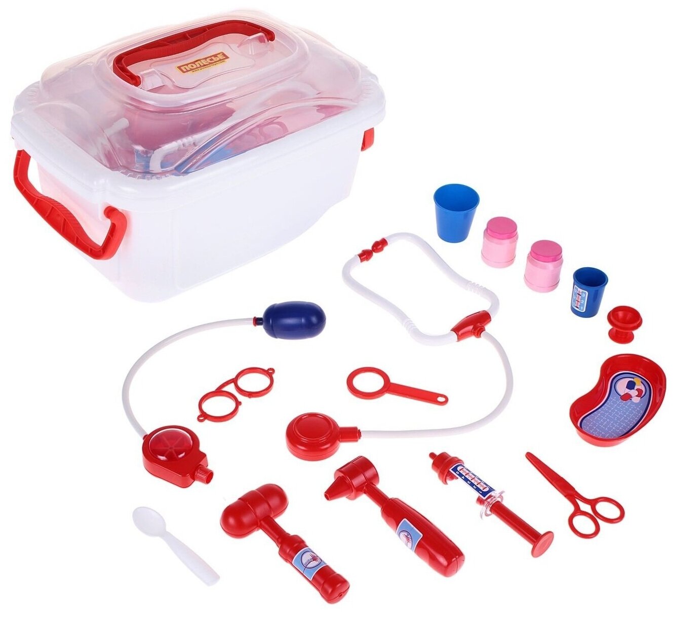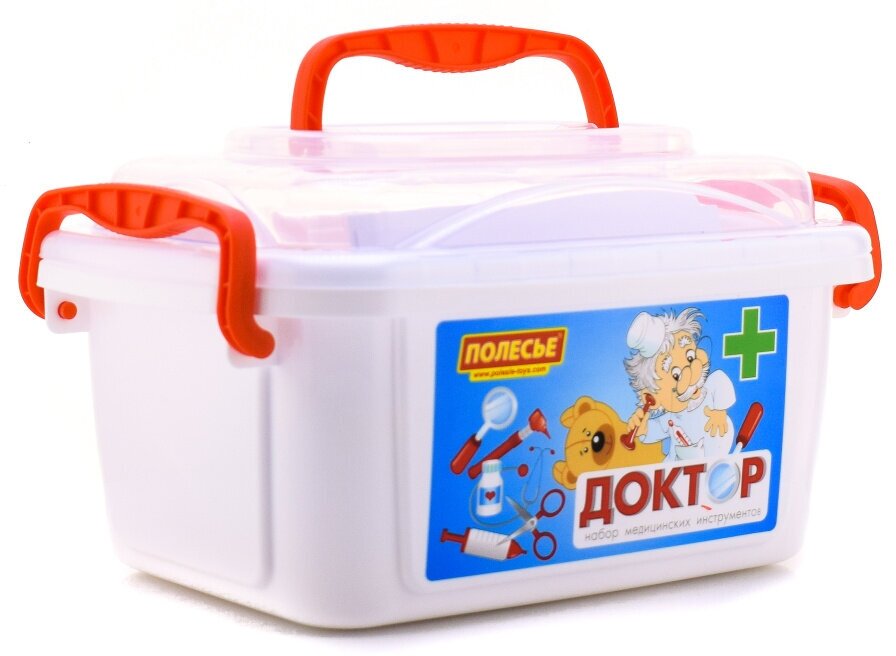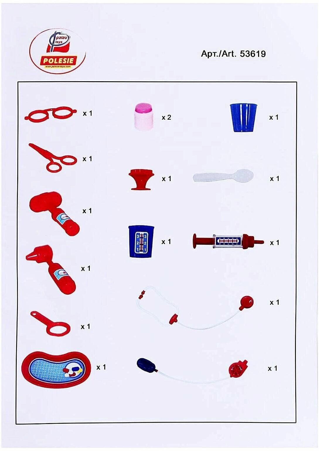 | Комплектация | ножницы – 1 шт., очки – 1 шт., лупа – 1 шт., шприц – 1 шт., лоток для инструментов – 1 шт., ложечка – 1 шт., стетоскоп (для прослушивания сердца и лёгких) – 1 шт., тонометр (для измерения давления) – 1 шт., отоскоп (инструмент лор-врача) – 1 шт., молоточек – 1 шт., мерный стаканчик с крышкой – 1 шт., стаканчик – 1 шт., баночки – 2 шт. |