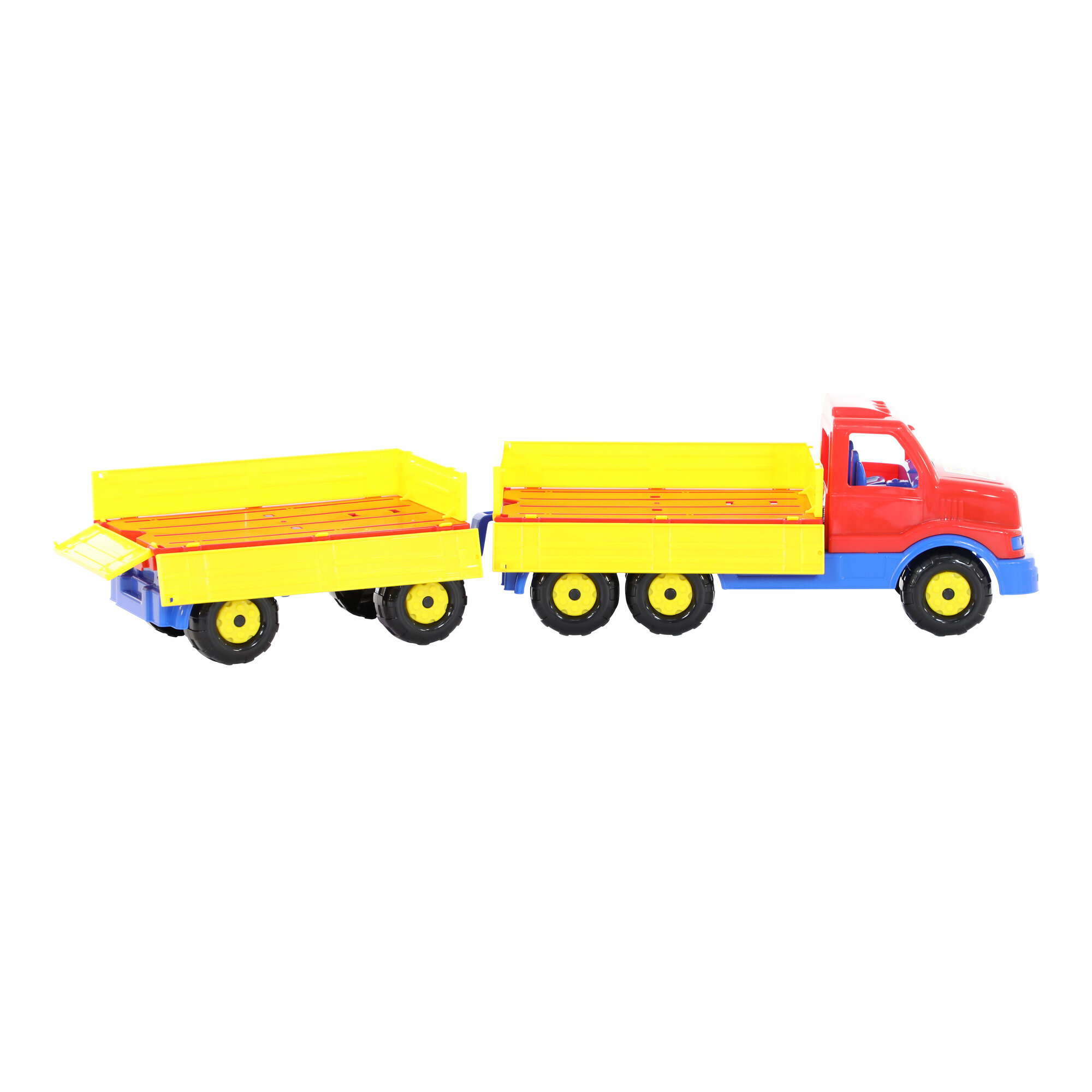 Автомобиль бортовой с прицепом ? это идеальный выбор для увлекательных игр на свежем воздухе или в помещении. Машинка совмещает в себе яркий дизайн, безопасность и практичность. В кузов и прицеп машины поместится множество разных предметов, которые ребенок с удовольствием будет перевозить. Большие колеса обеспечивают устойчивость и повышенную проходимость. Игрушка выполнена из прочного и безопасного пластика.