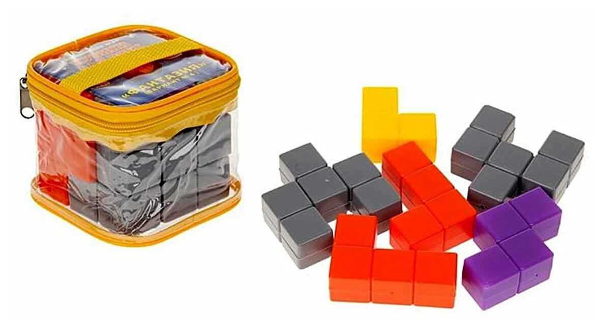 Описание: В составе этой игры тоже 27 отдельных кубиков, соединённых между собой определенным образом, в результате чего получаются фигуры разной конфигурации. Вариант №4 состоит из шести элементов: один уголок, две фигуры похожих на букву Г, одна фигура похожая на зигзаг, и две арки с башней. Из набора можно сложить большое количество красивых фигур условно напоминающих робота, собачку, удава, ёлку, сказочный домик,… и, конечно же, сложить куб 3х3х3, чтобы убрать кубики в коробку (упаковку). Придумывание и самостоятельное составление различных фигур (построек), в том числе и кубов – цель игры достигнуты.