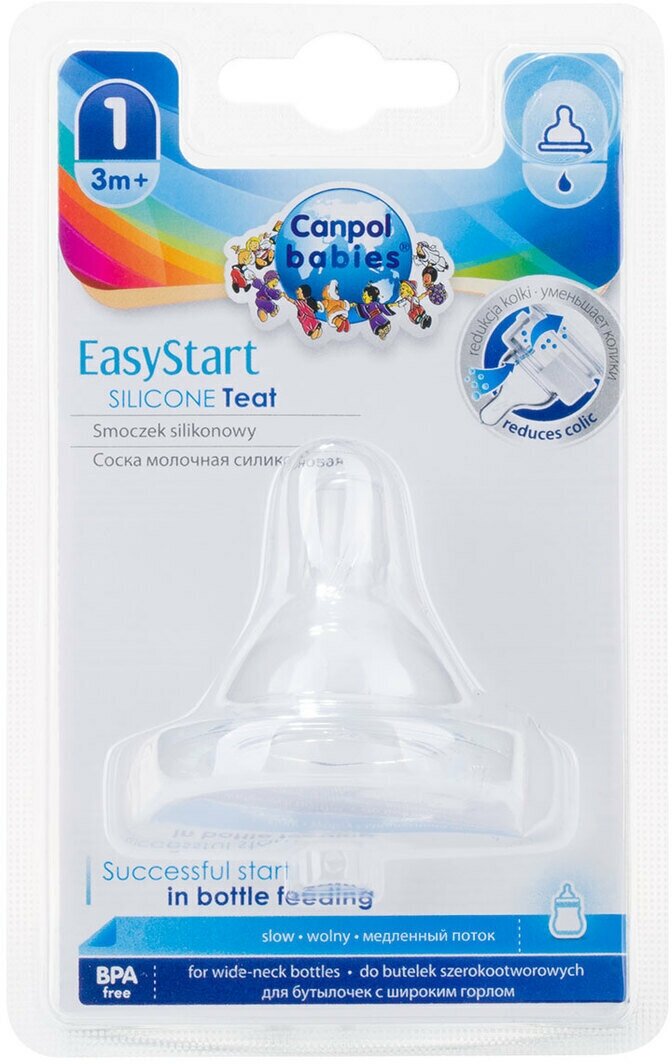 Соска силиконовая Canpol EasyStart №1 медленный поток предназначена для детей с 3 месяцев. Специально разработанная ортодонтическая антиколиковая соска для бутылочек EasyStart с широким горлышком. Соска изготовлена из мягкого гипоаллергенного силикона.