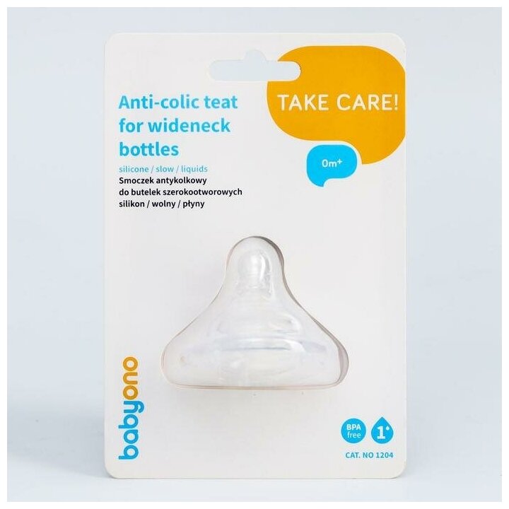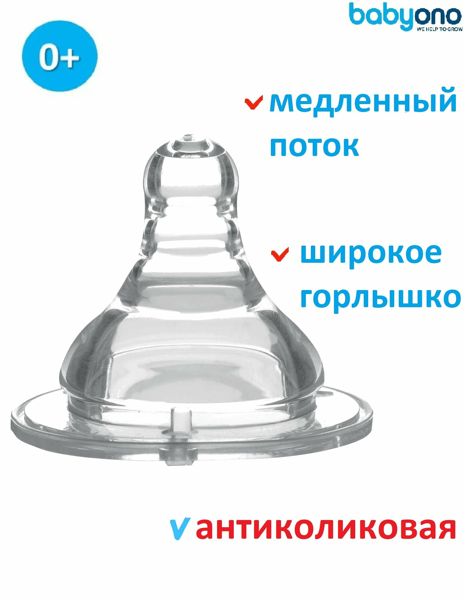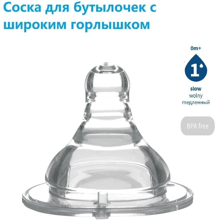 Соска антиколиковая с тройной антивакуумной системой из силикона для бутылочек с широким горлышком. Соска защищает ребёнка от заглатывания воздуха и предотвращает колики. Соска удлиняется при кормлении, имитируя материнскую грудь, благодаря эластичному наконечнику. Интенсивность потока должна соответствовать возрасту и индивидуальному развитию ребёнка, а также густоте пищи.