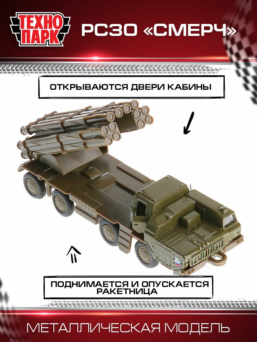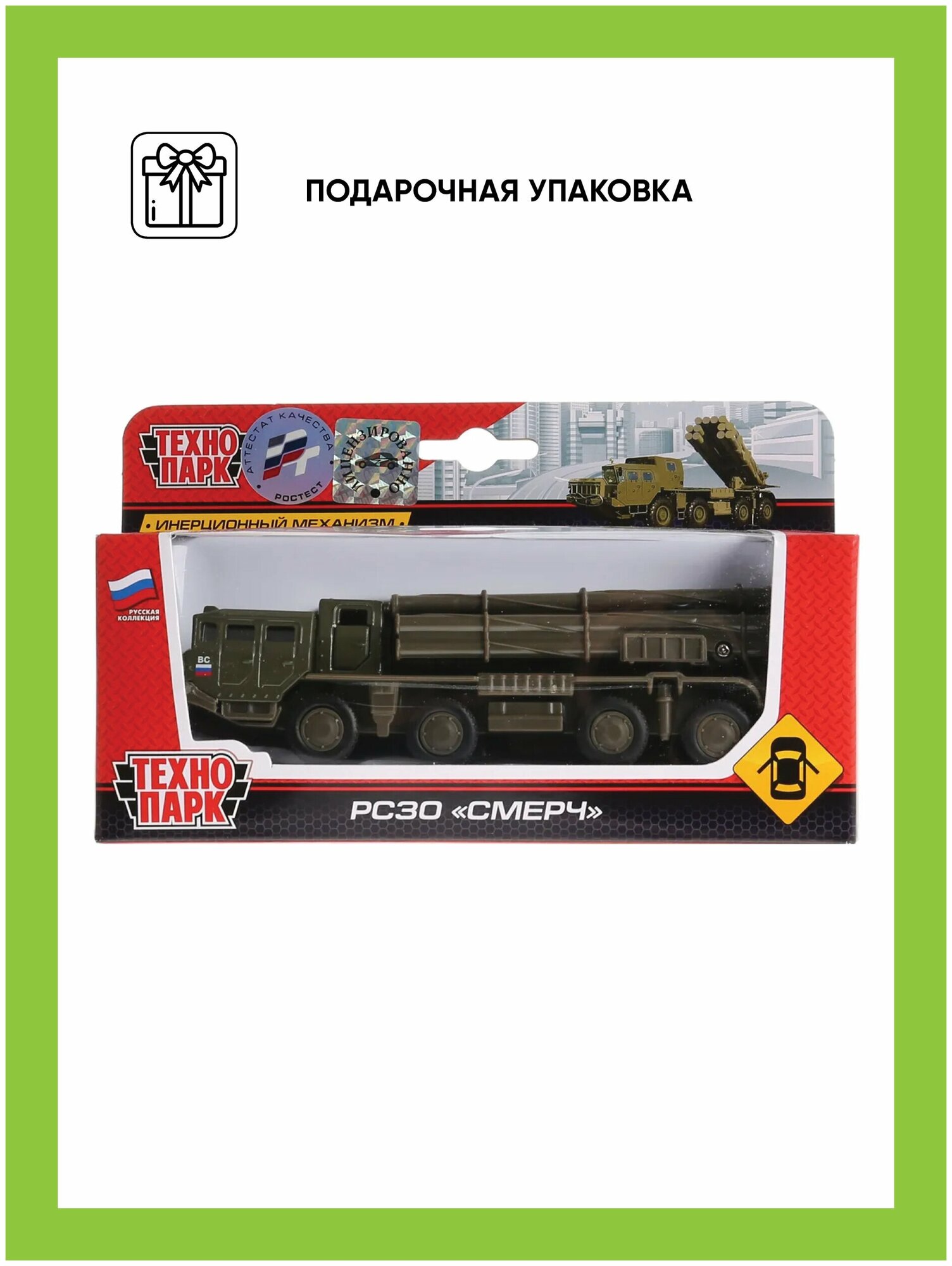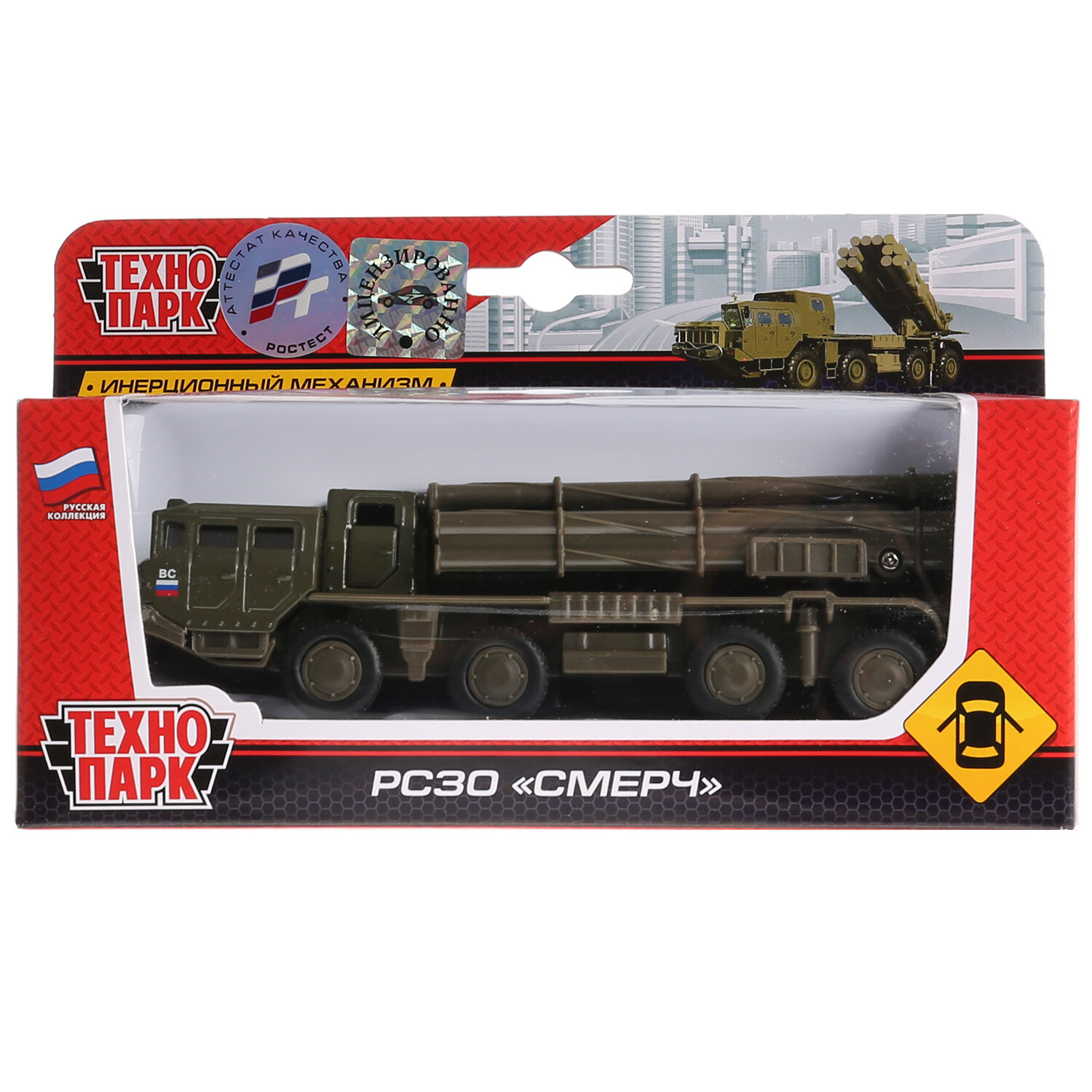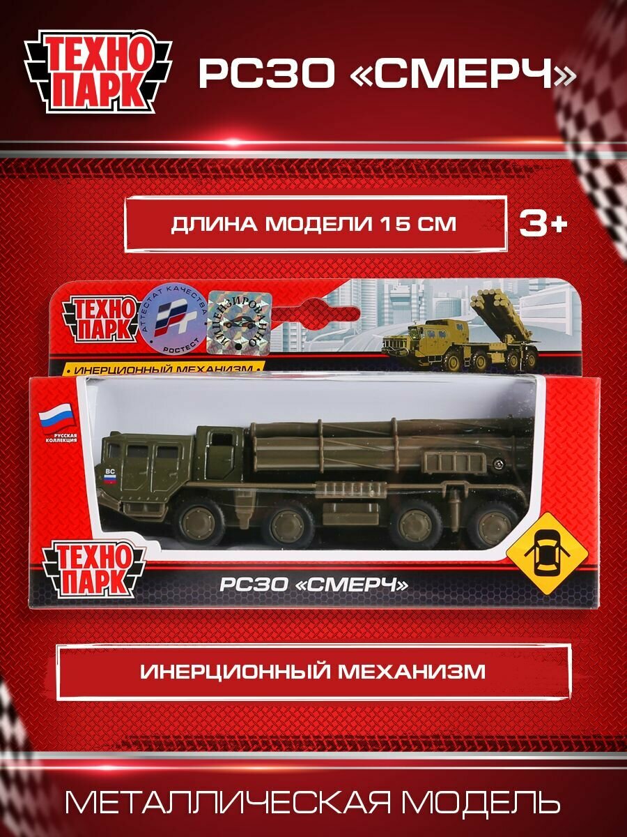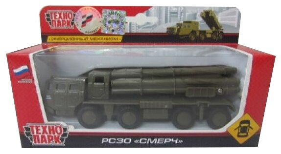 Инерционная металлическая модель - РСЗО – Смерч, 15 см, Технопарк, Инерционная металлическая модель РСЗО «Смерч» от отечественного бренда «Технопарк» украсит собой коллекцию военной техники. Её обладатель будет впечатлён подробной проработкой дизайна автомобиля и его функциональностью. Машина снабжена инерционным механизмом, что позволяет придавать ей ускорение несколькими прокатами, а благодаря открывающимся дверям можно рассмотреть, как она устроена внутри. Особенности: - Модель РСЗО «Смерч» исполнена в реалистичной манере миниатюрной копией своего реального прототипа. - Степень проработки всех деталей и элементов – высокая. - Модель имеет маскировочную окраску цвета хаки, на борту имеются знаки отличия и специализированные надписи. - Колёса функциональные, снабжены инерционным механизмом, благодаря чему игрушка способна после нескольких прокатов самостоятельно проезжать некоторые расстояния. - Благодаря открывающимся дверям, можно рассмотреть, как устроена машина внутри. - Модель может стать как любимой игрушкой, так и ценным экспонатом коллекции ценителей военной техники. - Изготовлена игрушка из прочного металла, некоторые элементы декорированы качественным пластиком. - Благодаря качественным материалам и устойчивым краскам модель будет долго радовать первозданным видом своего обладателя. - С транспортным средством можно придумать интересные сюжеты для игр, развивая фантазию, воображение и совершенствуя моторику рук и координацию движений. - Игрушка имеет сертификаты качества, требуемые для производства детских товаров.