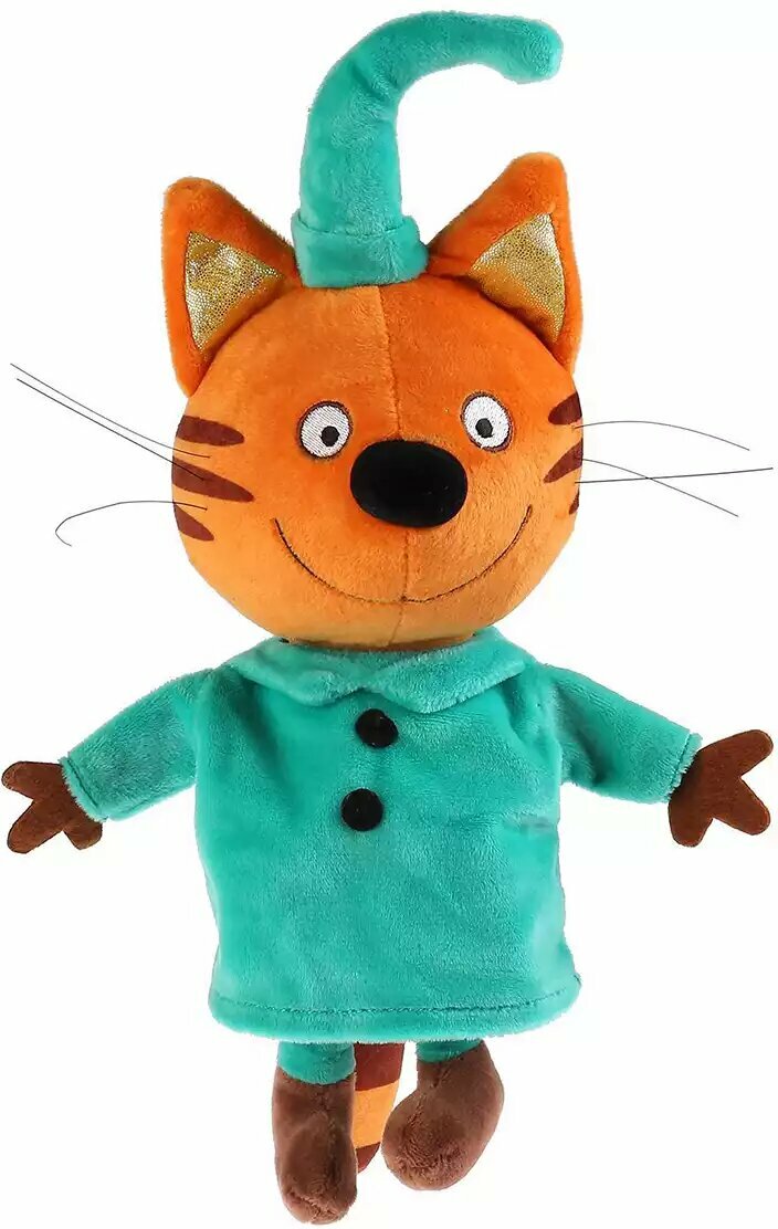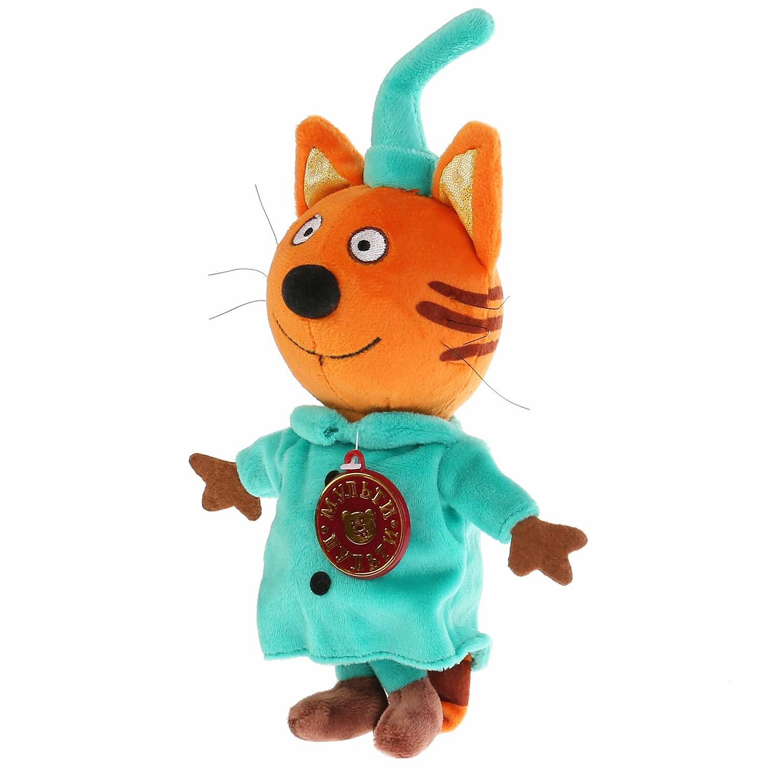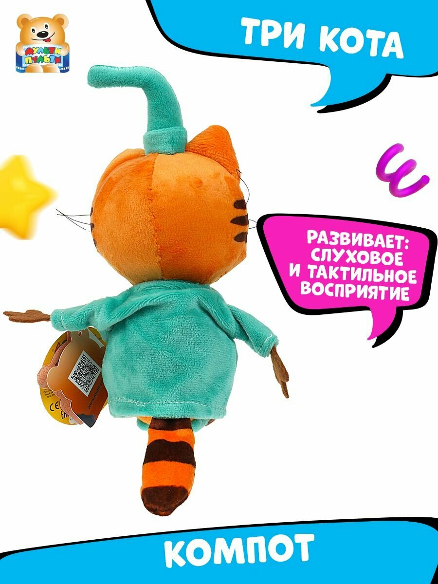 Озвученная мягкая игрушка 3 кота – Компот, 16 см, Мульти-пульти, V92305/16 Для деток, которые обожают мультсериал о трёх забавных котятах, отличным подарком станет мягкая игрушка, исполненная по образу одного из его героев – кота по имени Компот. Кот Компот имеет яркое рыжее тельце с полосатым хвостом, он нарядился в яркий бирюзовый костюм, а на голову надел праздничный колпак. Если нажать игрушке на ушко, то она поговорит с малышом и порадует его исполнением весёлой песенки. Особенности: - Игрушка выполнена по мотивам детского мультфильма «Три кота» в образе одного из главных персонажей – Компота. - Игрушка имеет внешнее сходство с экранным прототипом, она одета в яркий бирюзовый костюм с забавным колпачком, у кота оранжевое мягкое тельце с забавной полосатой физиономией, усами и большими глазами. - Все декоративные элементы игрушки выполнены вышивкой. - Игрушка имеет встроенный звуковой модуль с русским чипом и озвучена профессиональными актёрами. - В памяти игрушки несколько реплик и песенка из мультфильма, которыми она сможет развлечь ребёнка, стоит только слегка нажать на неё. - Малыши с удовольствием будут инсценировать запомнившиеся сюжеты из любимого мультфильма или придумывать собственный сценарий, развивая память, фантазию и воображение. - Игрушка исполнена из качественного приятного на ощупь текстиля и плюша с мягким гипоаллергенным наполнителем. - Игрушка приятна для тактильных ощущений малыша, совершенствует моторику рук, слуховое и зрительное восприятие. - Изделие отвечает требованиям и стандартам, необходимым для производства детских игрушек.