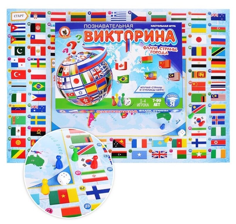 Познавательная викторина Флаги, страны, города от бренда Русский стиль поможет детям в игровой форме освоить новый и интересный материал. Ребята смогут узнать новые страны мира, их города и флаги. Это поможет в дальнейшем обучении в школе. У ребенка расширится кругозор и возникнет большой интерес к новым знаниям. В викторине может участвовать от двух до четырех игроков. Подобная игра отлично пригодится в школе на уроке или в детском саду, чтобы детишек можно было научить новому.