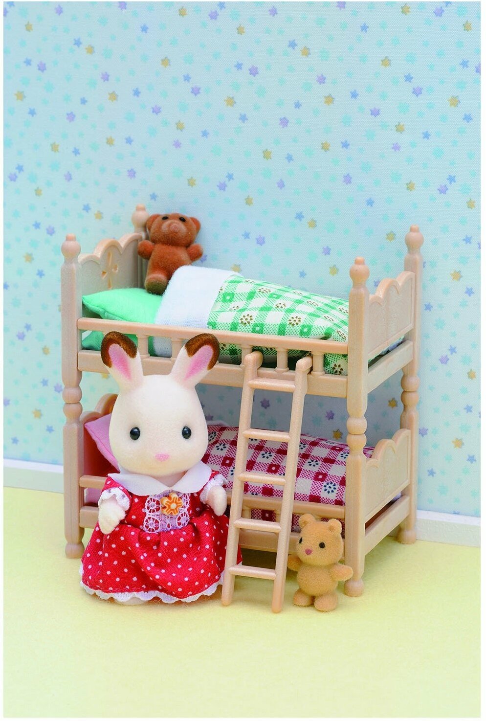 Набор мебели для детской спальни Sylvanian Families 2926 поможет полностью обустроить комнату для малышей. В набор входит 2 кровати, которые можно поставить друг на друга, соединив лесенкой. В наборе есть также стеллаж с множеством ящиков для игрушек, учебников и тетрадей и прочих мелочей. В комплекте: 2 кровати и лестница постельные принадлежности: матрасы, одеяла и подушки стеллаж с ящичками 2 игрушки книги, расписание, канцелярские принадлежности Внимание: зверюшки в набор не входят. Сказочный мир игровых наборов Sylvanian Families разнообразен - это всевозможные зверюшки, у каждого из которых есть собственный дом, семья, работа. Состав семей в игровых наборах Sylvanian Families не ограничивается стандартным «папа, мама, ребенок», здесь есть даже бабушки и дедушки. Герои игровых наборов Sylvanian Families разнообразны: кролики, еноты, медведи, мыши, ежи, белки и многие другие. Однако разнообразием героев мир игрушек Sylvanian Families не ограничивается. Дома, предметы мебели, игрушечная еда и многие другие аксессуары представлены в ассортименте игрушек Sylvanian Families.