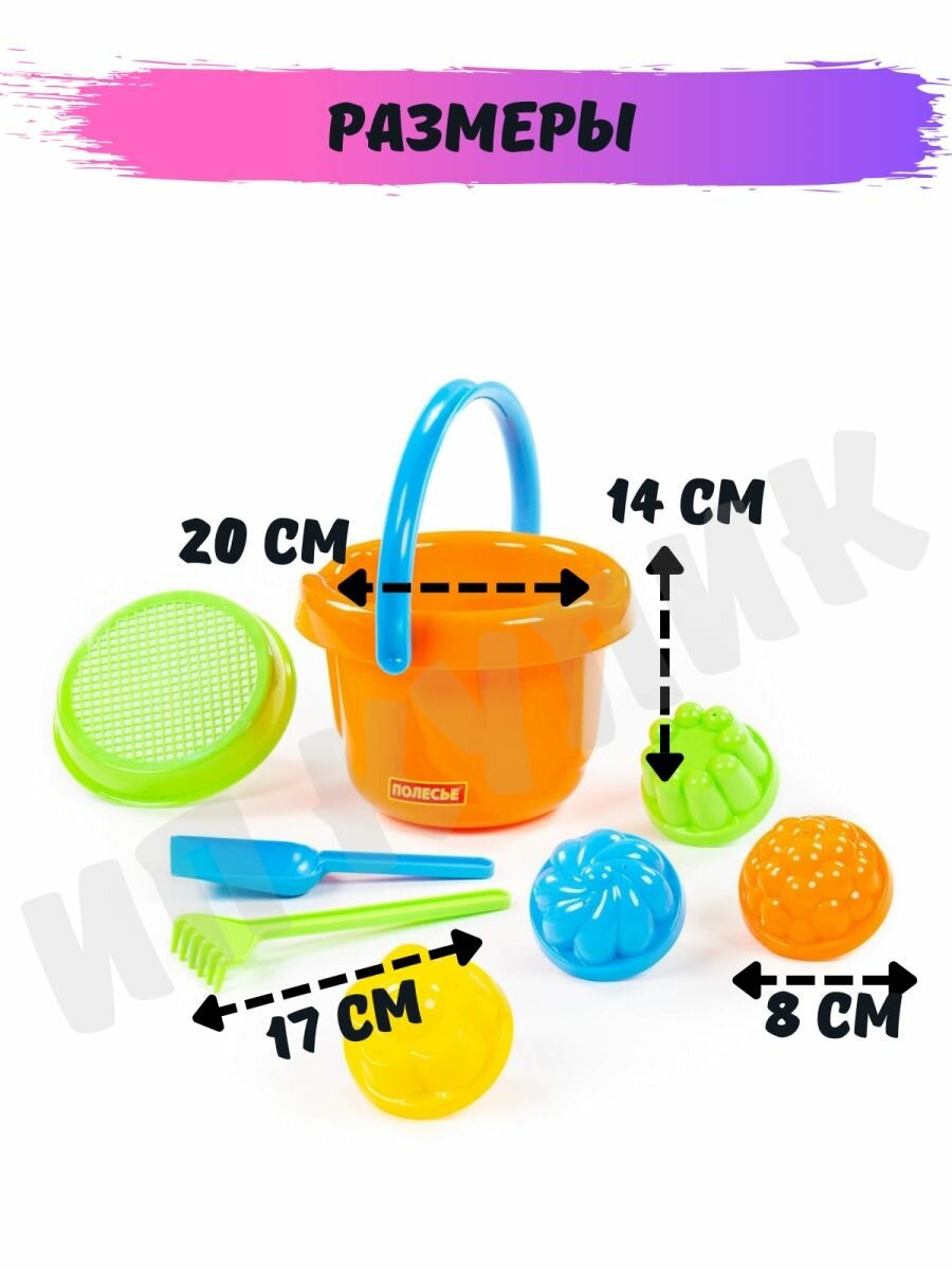 | Состав набора | ведро большое, ситечко, 4 формочки, лопатка, грабельки |