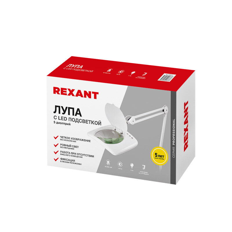"Лупа на струбцине квадратная настольная 5Х с подсветкой 108 LED, белая REXANT предназначена для визуального увеличения различных мелких предметов или их фрагментов. Она используется в косметологии, при выполнении ювелирных и радиомонтажных работ, при ремонте часов, в биологии и медицине, для организации труда людей со слабым зрением, а также для других работ, где требуется дополнительное увеличение и подсветка рабочего поля. Такая оптическая система состоит из линзы, удобного пантографического механизма и бестеневой подсветки. Основные преимущества: 1. Линза изготовлена из стекла. Обеспечит наиболее четкое изображение с минимальным уровнем искажения