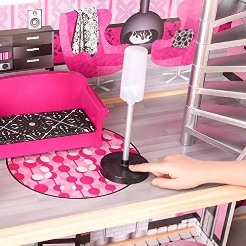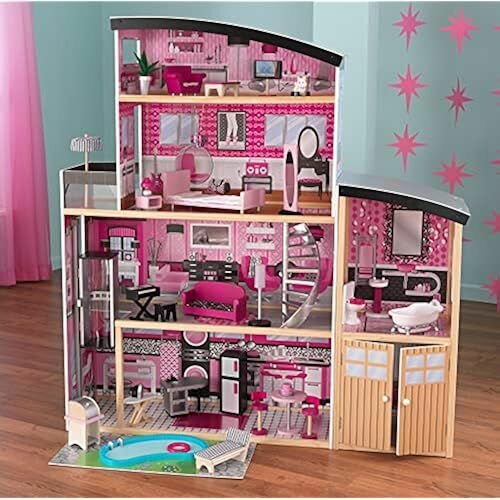 Уникальный кукольный домик для Барби «Сияние» от знаменитого бренда KIDKRAFT спешит порадовать всех великолепным набором функций. Планировка дома имеет четыре этажа. В нем расположено пять комнат с более 30 элементами мебели и украшений интерьера. Кроме того, здесь есть лифт, балкон и даже лестница. В таком доме можно поселить целую семью кукол Барби, собирать их на балконе за чаепитием, удобно передвигать по комнатам, расставлять мебель, обновляя интерьер.
