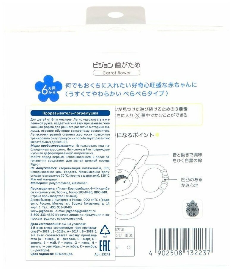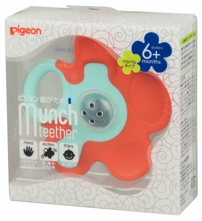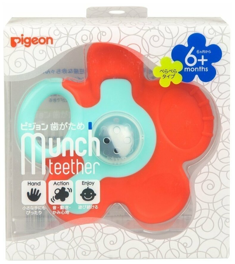 Прорезыватель-погремушка Pigeon Munch teether для детей от 6-ти месяцев. Легко удерживать в маленькой ручке, издает мягкий звук при захвате. Уникальная форма для раннего развития моторики малыша, игровое обучение сенсорному восприятию. Лепесточки разной степени жесткости позволяют тренировать силу прикуса и способствует развитию жевательных движений.