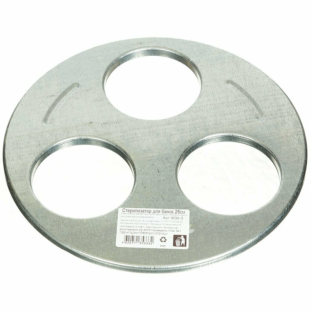 Стерилизатор для банок (трёхместный) – металлическая насадка, которая может превратить вашу кастрюлю или чайник в установку для стерилизации банок горячим воздухом. Стерилизатор делает процесс загрузки банки комфортным, препятствует разбрызгиванию кипятка. При стерилизации таким способом можно предотвратить утечку пара, и связанный с ним нагрев и увлажнение помещения. Банка плотно и герметично прижимается к отверстию под собственным весом, а процесс паровой обработки происходит быстро и эффективно.При работе с бытовым стерилизатором для банок не забывайте о правилах гигиены и безопасности. Перед началом работы помойте инвентарь, посуду, стол, тщательно очистите руки. Устанавливая и снимая банку со стерилизатора защищайте руки прихватами или воспользуйтесь полотенцем. Всегда проверяйте банки на наличие сколов, трещин и неотмываемых загрязнений.