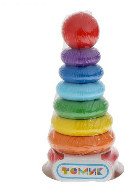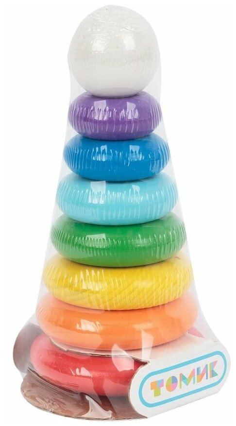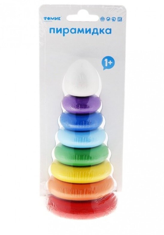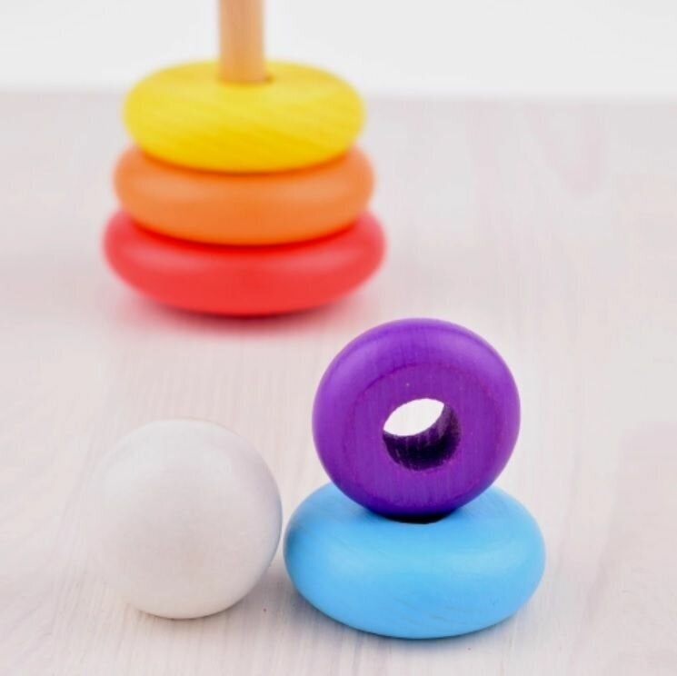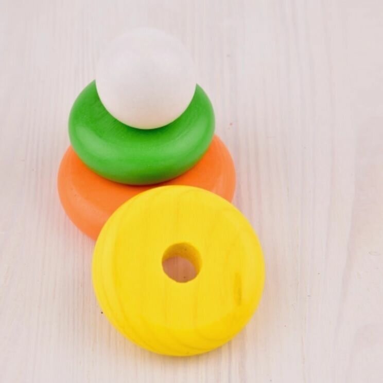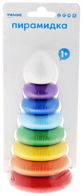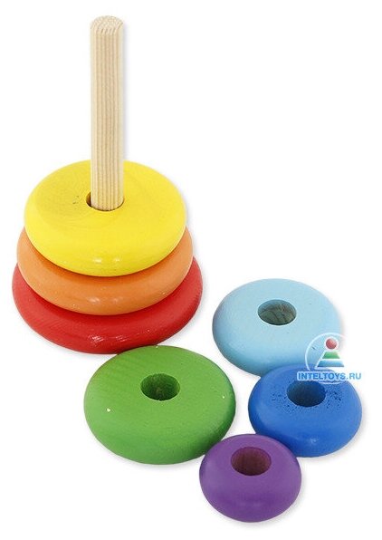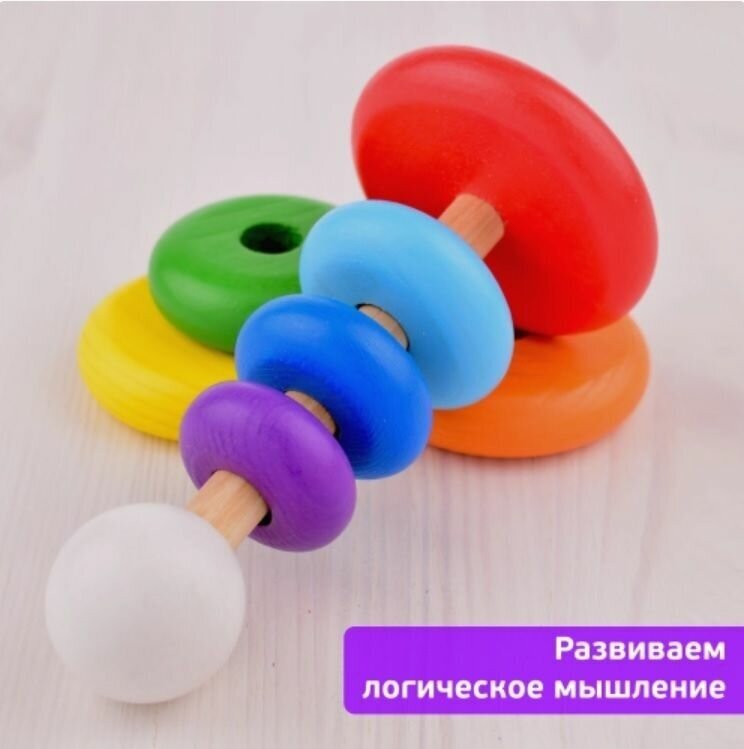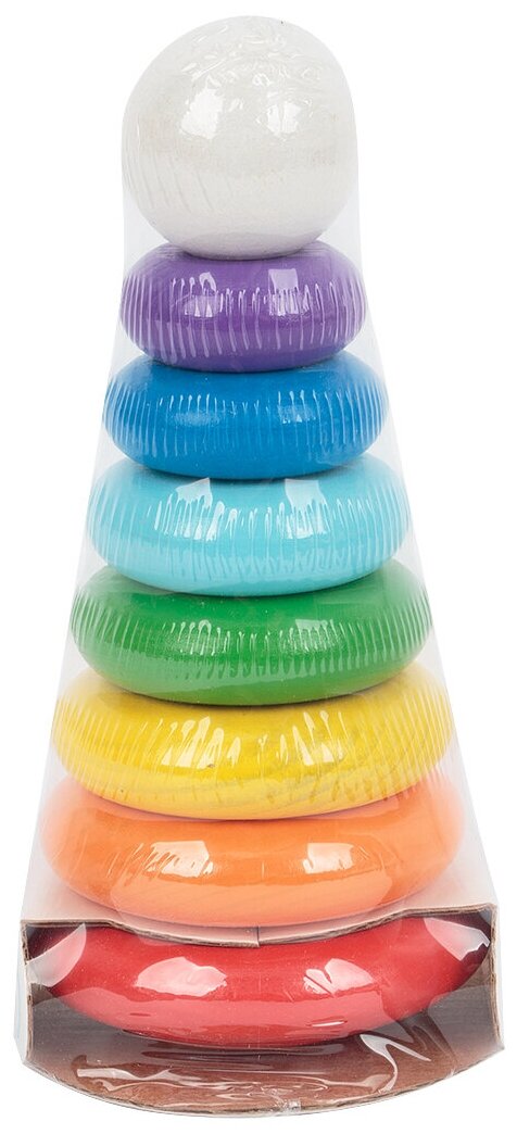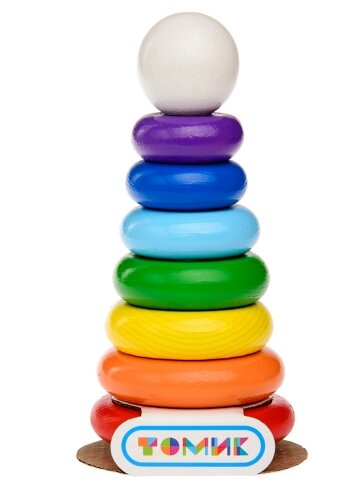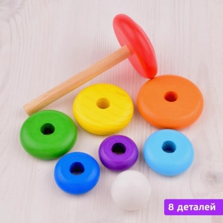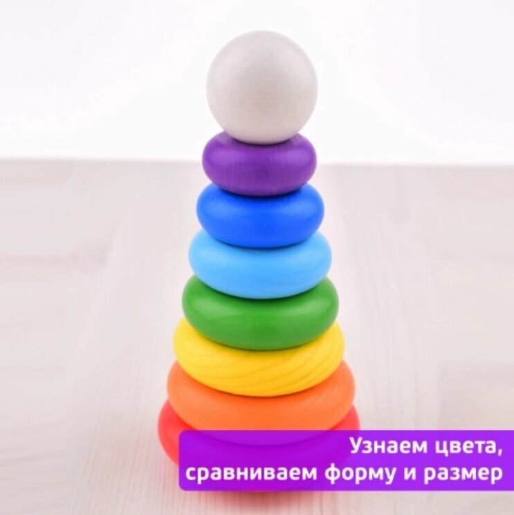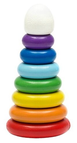 Данная пирамидка состоит из 8 элементов, изготовленных из древесины. С помощью шелкографии их окрасили в яркие сочные цвета. Пирамидка — классическая развивающая игра для малышей, в которой необходимо надевать колечки разного размера на штырек. Играя с такой игрушкой, ребенок получит первые знания о счете и цветах радуги. Кроме того, пирамидка развивает мелкую моторику рук, логическое мышление и координацию движений.