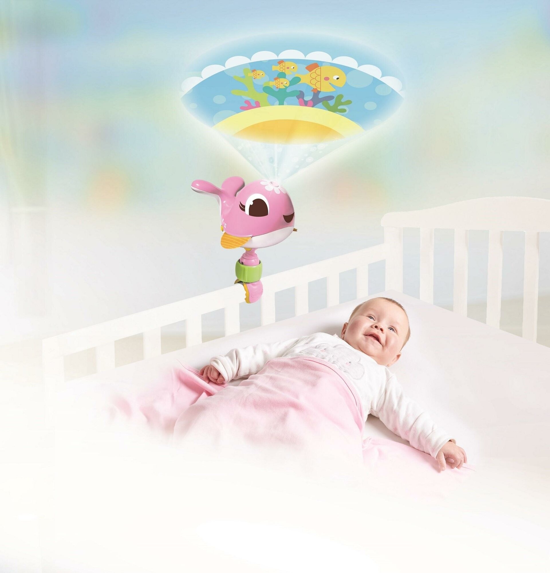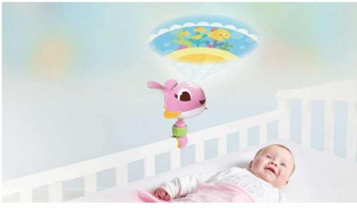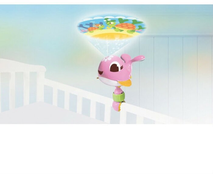 Игрушка-проектор Коди, представленная брендом Tiny Love, позволит малышу не только спокойно засыпать, но и развлекаться, так как проектор способен показать ему забавные картинки с различными движущимися на волнах морскими животными. Сама игрушка выполнена в виде очаровательного розового кита. Проектор имеет звуковой модуль, способный воспроизводить в течение тридцати минут успокаивающие мелодии, а также белый шум, который стимулирует засыпание. Громкость звука легко регулируется.