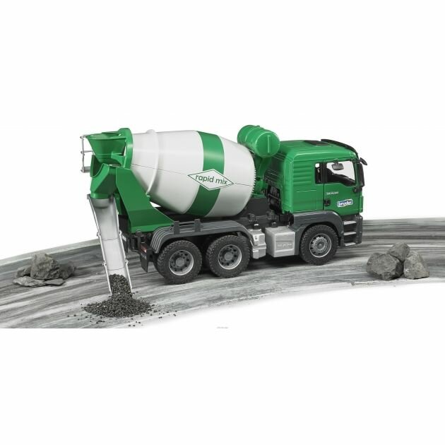Машина от бренда Bruder, выполненная в масштабе 1:16, представляет собой бетономешалку марки MAN TGS. В дизайне и техническом аспекте игрушки были соблюдены все детали, чтобы игровой процесс с ней был максимально реалистичным. Массивная кабина водителя оснащена открывающимися дверями, за которыми расположен детально проработанный салон. В него ребенок сможет поместить фигурку из серии bworld (Bruder). Позади кабины находится барабан, направление вращение которого можно регулировать при помощи специального поворотного механизма, расположенного на резервуаре с водой, который находится между кабиной и этим самым барабаном. Из данного резервуара вода сможет поступать в барабан при помощи шланга. В задней части барабана находится желоб, по которому содержимое будет переправляться в кузова грузовиков. Шасси бетономешалки оборудовано 6 колесами, обутыми в резиновые фактурные шины. Размеры игрушки действительно внушительны, что создает последний штрих, благодаря которому ребенок с головой погрузиться в увлекательный игровой процесс.