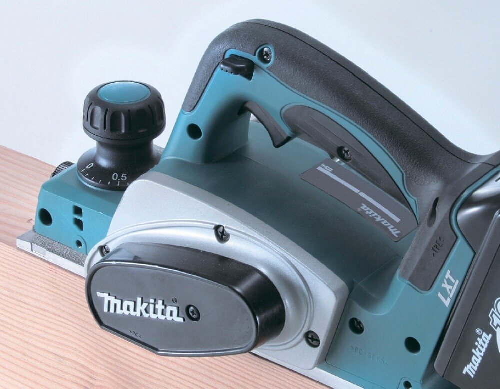 Аккумуляторный рубанок Makita предназначен для строгания изделий из древесины. Максимальная ширина строгания составляет 82 мм, а глубина строгания достигает 2 мм с шагом в 0,1 мм. При каждом шаге изменения глубины строгания на 0.1 мм слышен и чувствуется щелчок что позволяет точно регулировать глубину строгания. Корпус имеет удобную эргономичную рукоятку с резиноподобным покрытием.