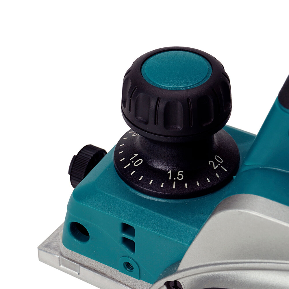 Удобная регулировка глубины строгания с градацией выбора 0.1 мм. При изменении глубины строгания на 0.1 мм слышен и чувствуется щелчок, что позволяет точно регулировать глубину строгания. На подошве имеется подножка, что предотвращает повреждение ножа и защищает заготовку от царапин, даже если барабан ещё не остановился после работы, а рубанок лежит на заготовке.