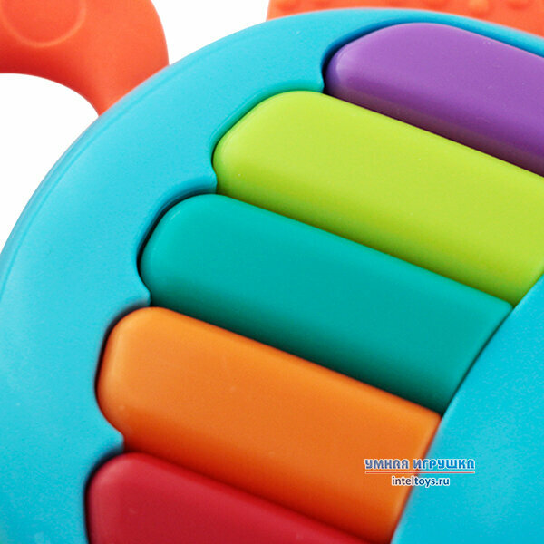 Яркая рыбка PIANO FISH – это интересная музыкальная игрушка и одновременно детский прорезыватель для первых зубов. Многофункциональность игрушки позволяет использовать её на разных этапах развития ребенка. Сначала игрушка заинтересует малыша как погремушка в виде весёлой рыбки. На удобном для захвата держателе в форме плавничка рыбки находятся подвижные рельефные колечки, которые создают шумовые эффекты при потряхивании. Колечки служат для развития осязания, самостоятельных движений, моторики обеих рук и движения пальцев. Кроха касается колечек, и они передвигаются с одного края держателя-плавничка на другой. Малыш сосредоточивается, наблюдает, и у него возникает желание повторить действие. В период прорезывания зубов рыбка поспешит на помощь малышу! Мягкие хвостик и плавничок с рельефной поверхностью идеально подойдут для массажа дёсен, устраняя их отёчность и усиливая циркуляцию крови. Игрушка поможет не только почесать дёсны, но будет ещё и отвлекающим фактором для малыша. На рыбке малыш заметит или случайно обнаружит разноцветные кнопочки, которые работают в двух режимах. В первом режиме 5 кнопочек выступают в роли клавиш пианино. Во втором режиме каждая кнопочка при нажатии активирует свою весёлую мелодию. Ваш малыш быстро научится выбирать полюбившиеся мелодии и напевать их вслед за рыбкой! Весёлые мелодии порадуют маленького первооткрывателя и подарят ему хорошее настроение. Музыка развивает чувство ритма, музыкальный слух, память и воображение. Яркая музыкальная игрушка-рыбка познакомит ребёнка с цветовой гаммой окружающего мира, вызывая зрительное сосредоточение, удивление, интерес. Радуйтесь и удивляйтесь вместе с малышом, ведь ему необходимо Ваше эмоциональное участие! Обнаруживая разные свойства игрушки вместе с Вами, ребёнок совершает свои первые открытия! Особенности - яркая окраска, шумовой эффект, погремушка+прорезыватель, 2 режима работы, пианино и веселые мелодии, многофункциональность, удобный плавничок для держания в руке.