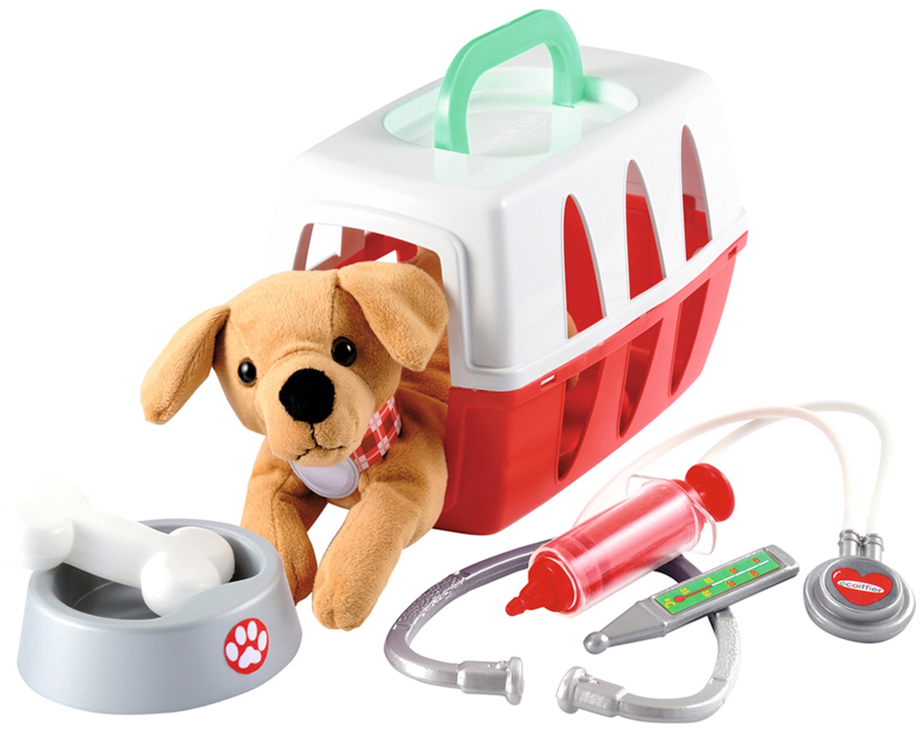 В наборе вы найдете стетоскоп, шприц, термометр, миску и кость для перекуса. Идеальная игрушка для маленького ветеринара.