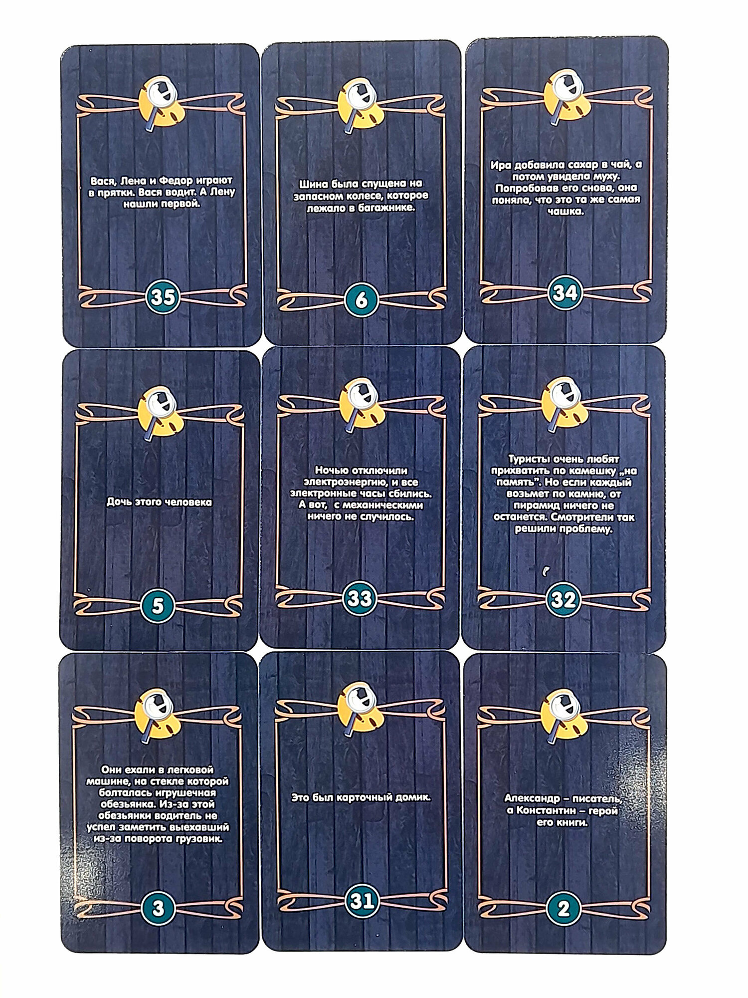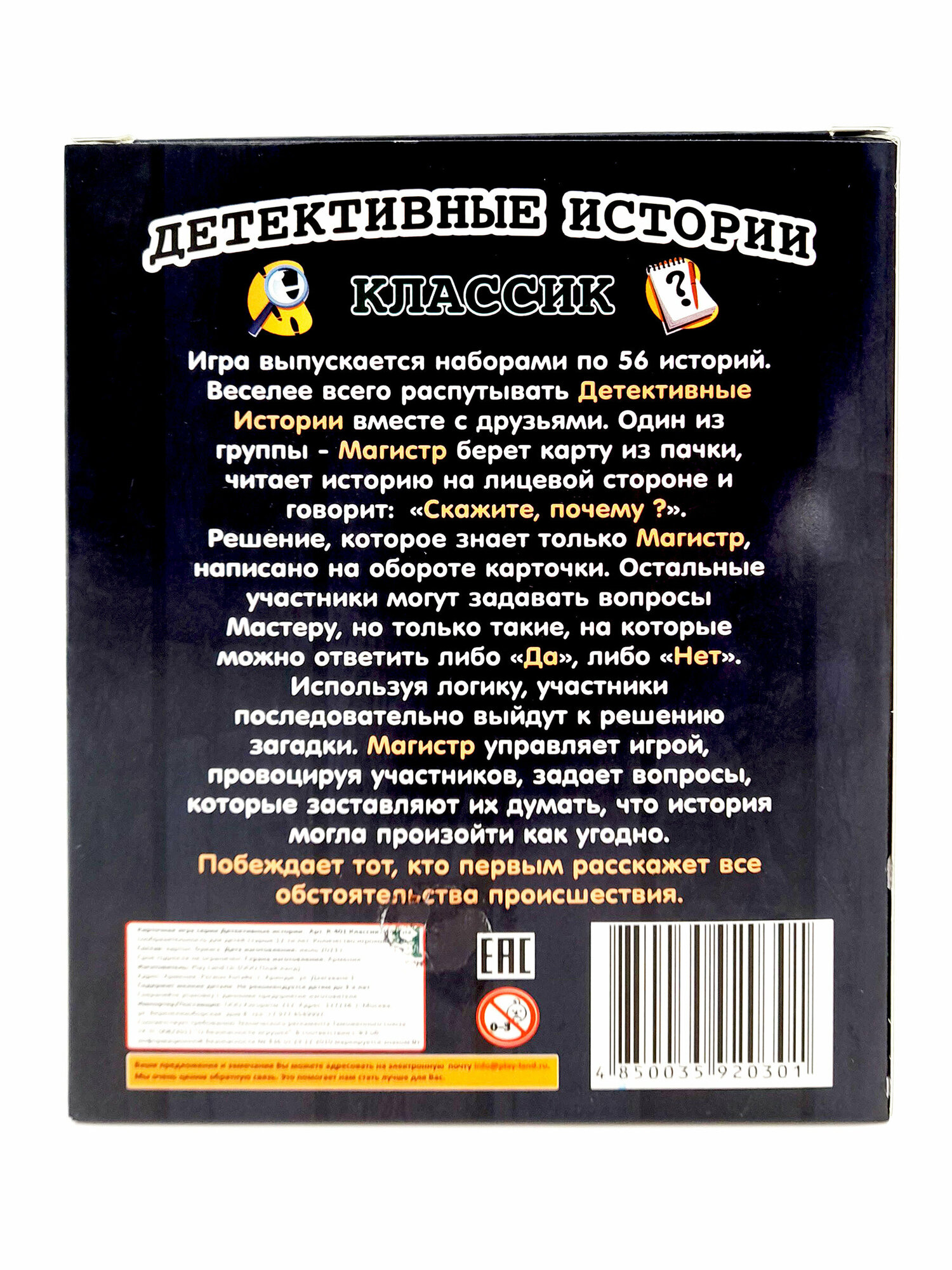 Игра, от которой бросает в дрожь. Выпускается наборами по 50 зловещих историй-загадок, каждую из которых нужно распутать с помощью логики и простых вопросов, подразумевающих только ответы «Да» или «Нет». Цель игры - узнать истинную причину произошедшей тёмной истории. Это хитроумные, жуткие и мрачные истории, которые возможно случились где-то на самом деле. Игра очень быстро завоевала любовь огромного количества верных фанатов. Зачастую разгадка не так уж проста: два-три вопроса, и вроде бы вы уже на правильном пути. Но, как часто бывает, кажущаяся простой история оказывается крепким орешком! Веселее всего играть в Детективные Истори вместе с друзьями. Кто-то становится ведущим Магистром и берет верхнюю карту из пачки. Он зачитывает вслух историю на лицевой стороне и говорит: «Скажите, почему?». Решение, которое знает только Магистр, написано на обороте карточки. Остальные участники могут задавать вопросы Магистру, но только такие, на которые можно ответить либо «Да», либо «Нет». Используя логику, участники последовательно выйдут к решению загадки. Магистр управляет игрой, провоцируя участников, задает вопросы, которые заставляют их думать что история могла произойти как угодно, в то время как единственный правильный ответ находится на обороте карточки. Побеждает тот, кто первым расскажет все обстоятельства происшествия. Тем не менее, в этой игре гораздо важнее сам процесс разгадывания, именно в нем проявляется смекалка, юмор и тонкость ума игроков. После того, как история разгадана, Магистр (тот же человек, или им становится новый игрок) берёт следующую карту из калоды и игра продолжается!