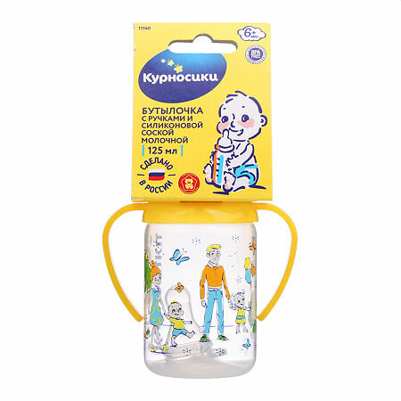 """Бутылочка Курносики полипропиленовая с ручками и силиконовой соской """"Колобок"""". Бутылочка произведена из полипропилена - термостойкого небьющегося пластика, не вступающего в химическую реакцию с молоком и не выделяющего вредных веществ при стерилизации."" Для получения более подробной информации, а также узнать мнение эксперта, настоятельно рекомендуем ознакомиться с данной статьей ."