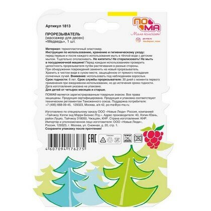 Прорезывание зубов у всех деток проходит по-разному. По отзывам мамочек, кто-то из деток сильно капризничает и даже температурит, а кто-то просто тянет все подряд в рот. Но все дети, без исключения, пытаются уменьшить зуд и грызут все, что им попадется на пути. Но специалисты разработали целый арсенал приспособлений в помощь родителям и малышам в этот сложный период жизни каждого маленького человечка. Эти приспособления именуются – прорезыватели. Прорезыватели бывают разные - от простых, до сложных многофункциональных конструкций. Порой ребенку бывает достаточно обычного силиконового прорезывтеля, чтобы получить облегчение. Такой прорезывтаель мы и предлагаем вашему вниманию. Данный прорезыватель ПоМа Медведь силиконовый сделан в виде мишки из силикона ярких привлекательных тонов. Прорезыватель тонкий, легкий, мягкий. Для удобства захвата маленькими ручками в нем есть отверстие. Прорезыватель поможет ребенку не только при прорезывнии зубов, но и для развития функции захвата и перекладывания предметов. Мягкий материал прорезывателя не поранит десна и позволит достать до самых дальних уголков челюсти.