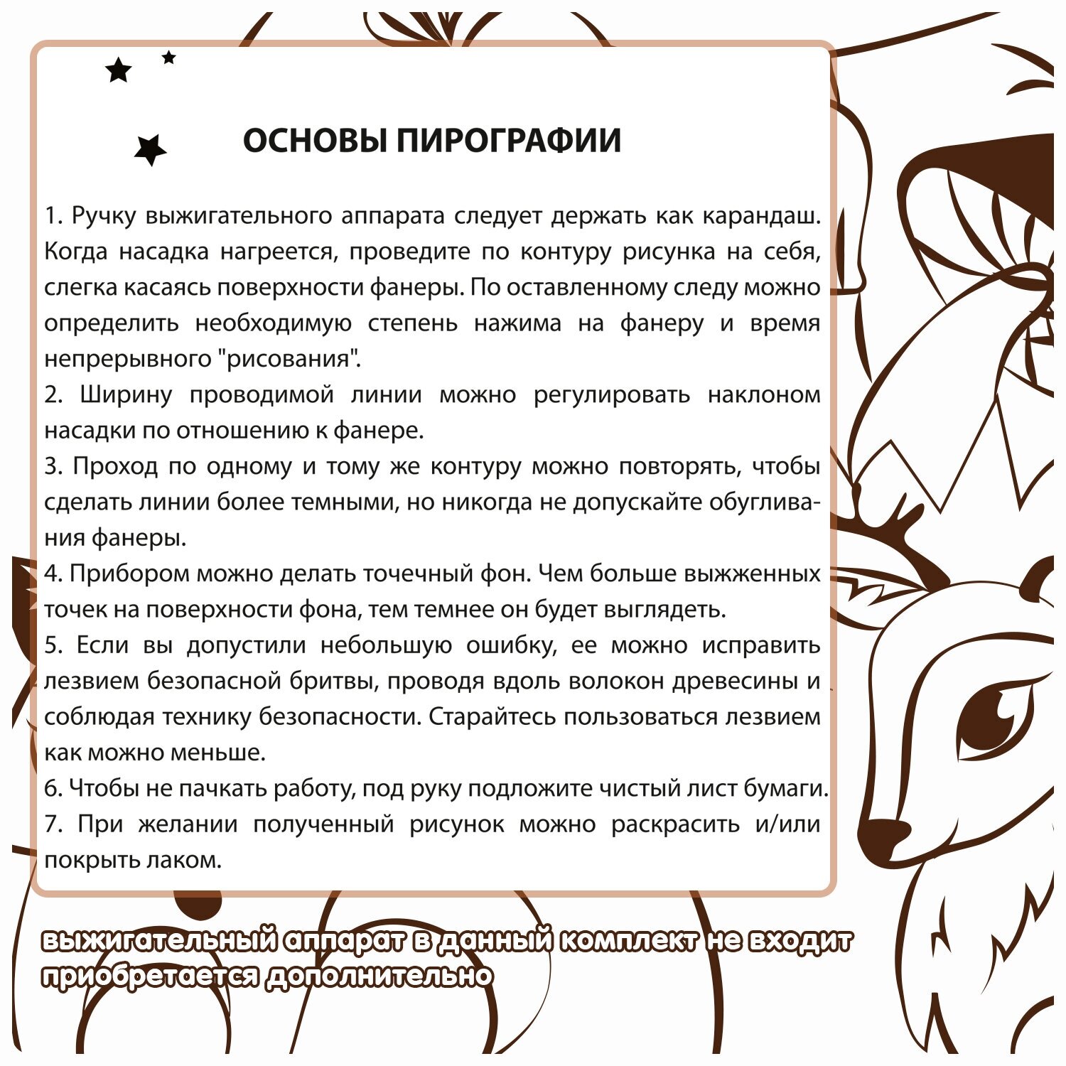 Набор для выжигания по дереву – это замечательный прибор для творчества. С его помощью и дети, и взрослые смогут создавать красивые и уникальные рисунки на деревянной основе. Чтобы облегчить эту задачу, в данном наборе представлены уже готовые контурные основы для выжигания по дереву. Проявив немного терпения и усидчивости, вы сможете создать запоминающуюся картинку, которая станет прекрасным подарком для близких и друзей. Выжигание является не просто игрой, но и самым настоящим творческим процессом!