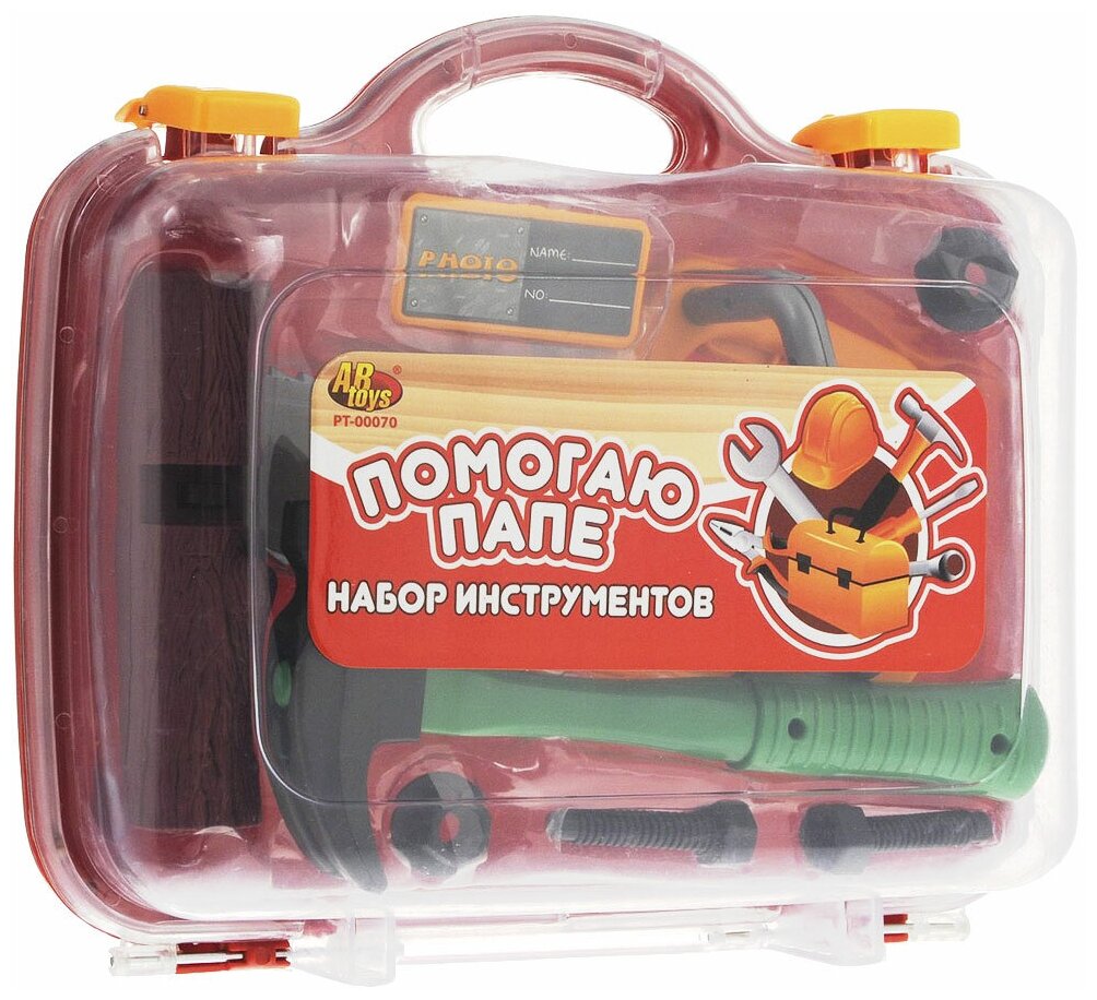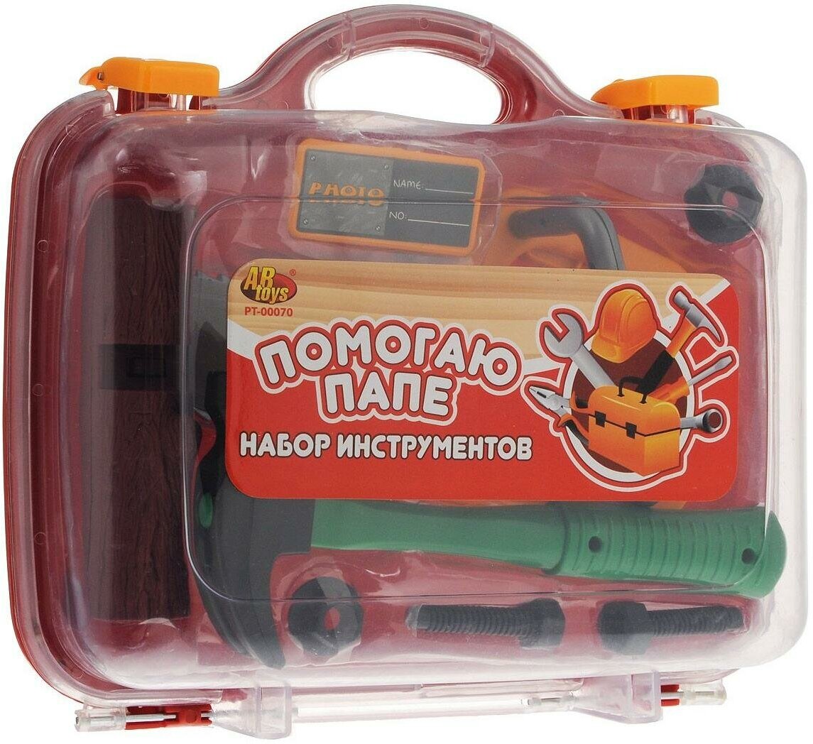 ABtoys Помогаю Папе Набор инструментов 8 предметов в чемодане необходимый элемент в игровой комнате каждого мальчика. В наборе: молоток, 2 шурупа, 2 гайки, электропила, кусок полена, значок. Игрушки с ранних лет научат малыша первичным навыкам работы с инструментами.