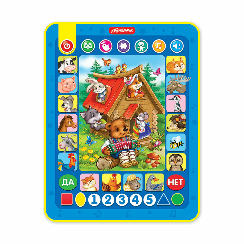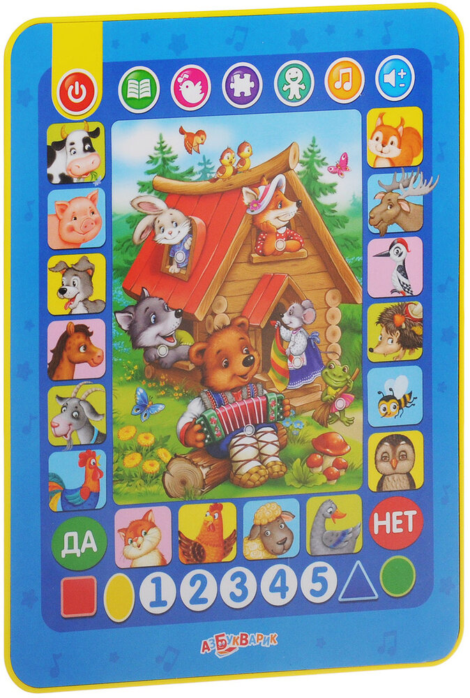 "Сказки помогают детям учиться! С новым интерактивным планшетиком дети не только послушают любимые сказки, но и выучат цифры, формы и цвета, познакомятся с животными. А в режиме «Умная сказка» ребенок будет выполнять задания по сказке «Теремок» и сможет проверить свои знания. В планшетике собрано 5 народных сказок («Теремок», «Репка», «Заюшкина избушка», «Колобок», «Петушок и бобовое зёрнышко»), 15 стихов о животных, 65 заданий и вопросов. Играй и учись! А ещё всех покупателей этого планшетика ждёт приятный сюрприз - QR-код для скачивания интерактивной азбуки в приложении ""Азбукварик""!"