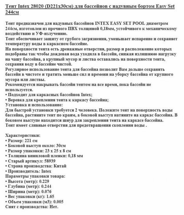 Сервис сравнения цен СкидкаГИД предлагает сравнить цены на товар «Тент для бассейна Intex круглый (244 см) 28020»