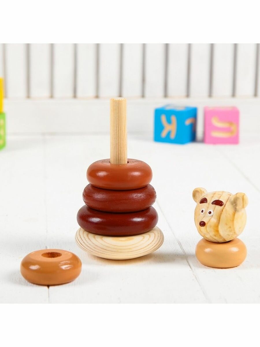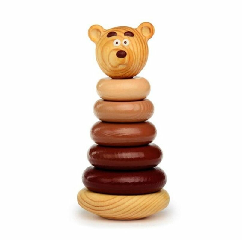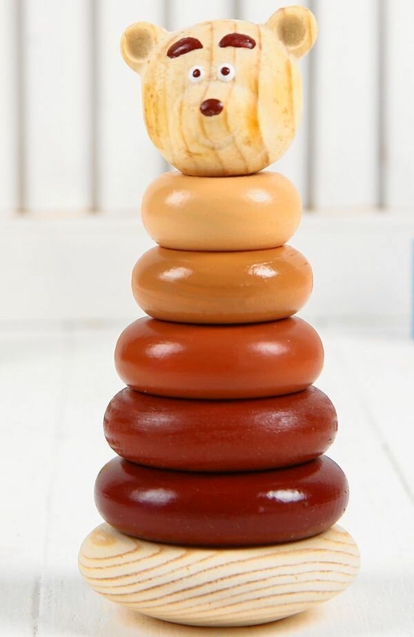 Небольшая и чень милая деревянная пирамидка Мишка Особенности - Пирамидка стоит на трех ножках, что заставляют игрушку при легком надавливании заваливаться на бок, таким образом игрушка с длинным штырьком становится менее травмоопасна. - Градиентный цвет колец, - уникальная форма головы-верхушки, выточенная из цельного дерева. - В пирамидке нет клеенных частей, использовано натуральное дерево (сосна) и лак на водной основе. - Верх и низ пирамидки сознательно оставлены неокрашенными.
