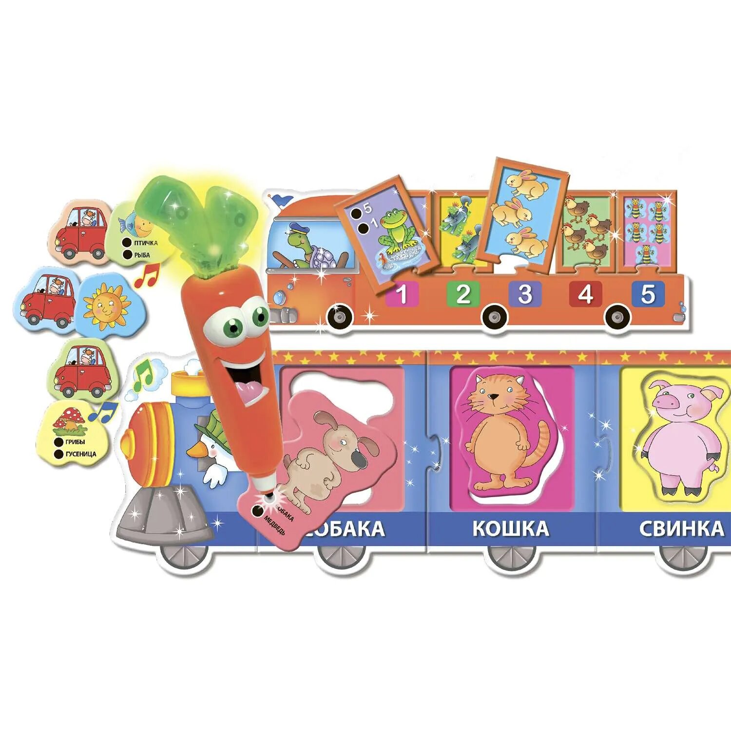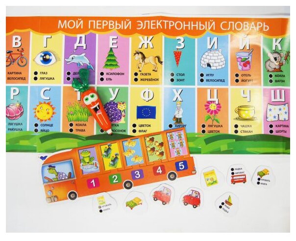 | Состав набора | 1 ручка-тестер Волшебная Морковка Каротина в комплекте с батарейками, 1 электронный пазл Паровозик, 1 электронный пазл Автобус, 24 карточки-мемори для игры Машинки, 1 плакат Мой первый электронный словарь |