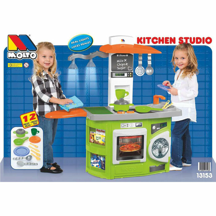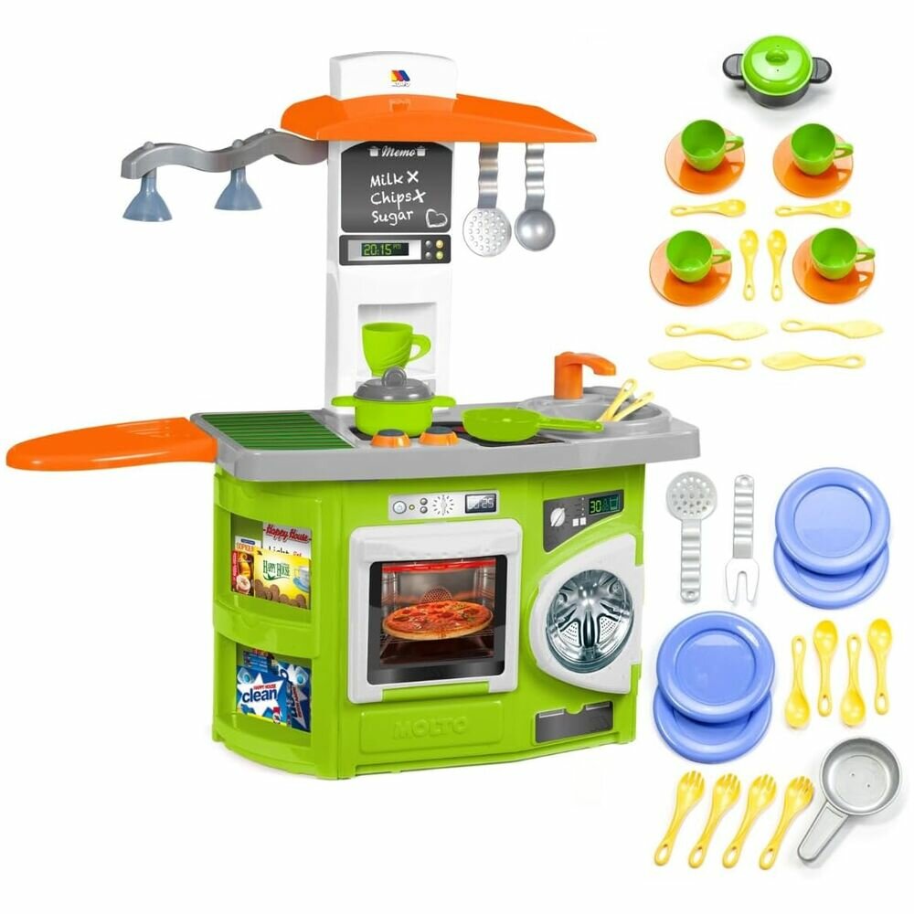 На этой игровой кухне смогут разместиться сразу 2 хозяюшки. Несмотря на ее компактный размер, эргономика здесь продумана до мелочей, поэтому детям не придется толкаться, чтобы приготовить каждому свое блюдо. А наличие световых эффектов создаст еще больший уют и сделает нахождение на кухне весьма комфортным. Она представляет собой кухонный гарнитур с варочной панелью, духовкой, стиральной машинкой, а также 12 дополнительными аксессуарами.Рабочая поверхность условно поделена на 2 части варочной панелью. Справа от нее находится раковина с краном, а слева – место для приготовления еды. Под рабочей поверхностью находится духовой шкаф, стиральная машина и полочки. Над рабочей поверхностью находится козырек с держателем для половников, а также лампа. Козырек держится на специальной ножке, на которой также находится небольшая доска для письма мелом и часы. Благодаря наличию световых эффектов играть с кухней намного интереснее. В качестве дополнительных аксессуаров выступают: стакан, чашка, кастрюля, крышка для кастрюли, противень, тарелка, чайная ложка, нож, ложка, вилка, шумовка, половник.