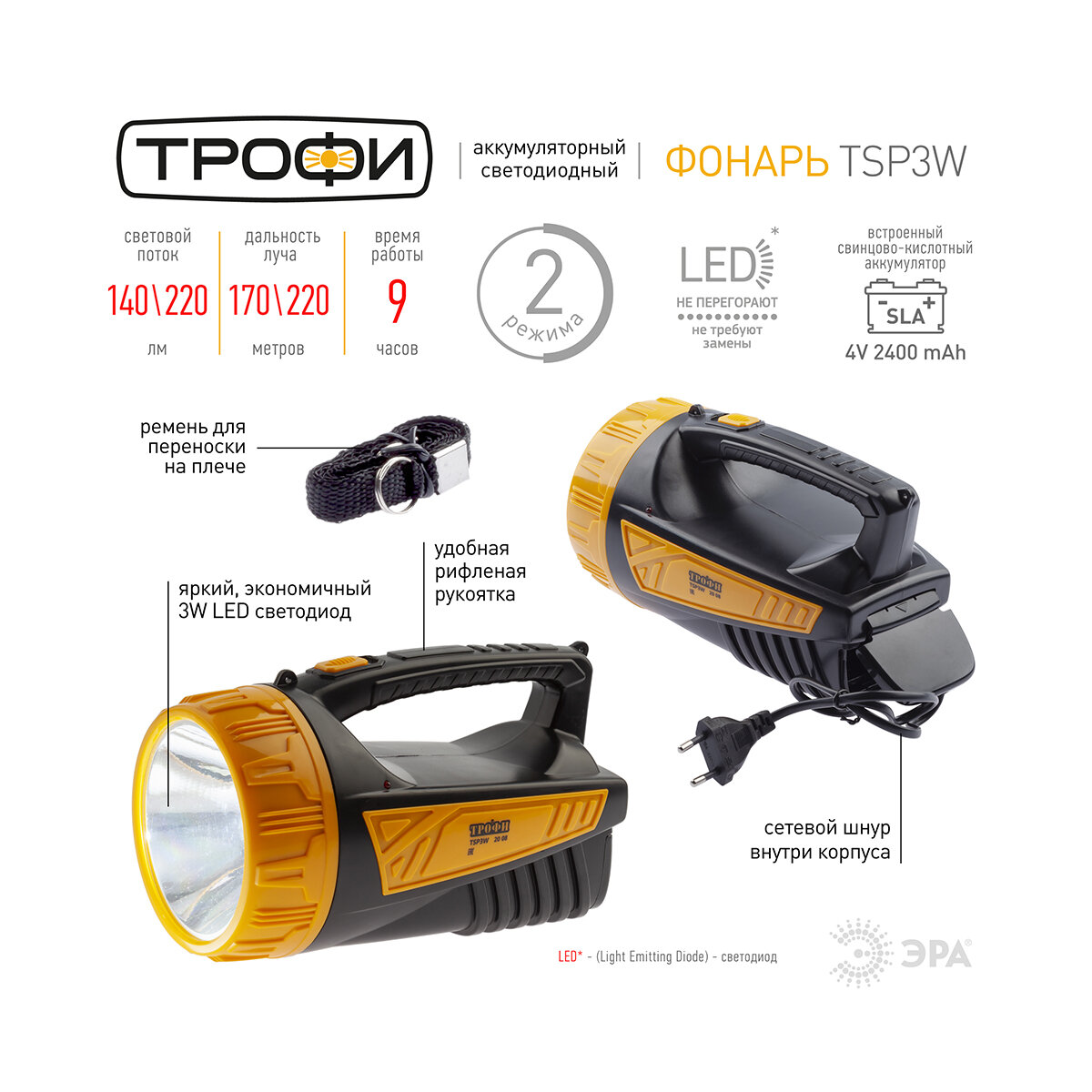 Трофи - мощный аккумуляторный LED-фонарь с удобной ручкой для переноски. Высокая дальность светового луча и повышенный световой поток. Интересный дизайн со множеством деталей. 6 часов непрерывной работы после одного заряда от сети 220 В. В данном фонаре установлен мощный светодиод 3 Вт с широким светоотражателем. Это обеспечивает отличные световые характеристики