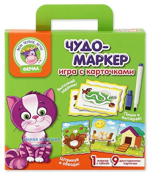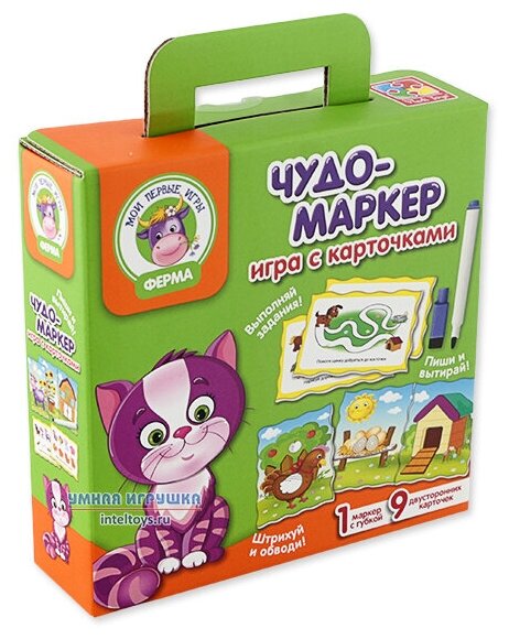 | Состав набора | чудо-маркер с губкой Пиши-вытирай, 9 двусторонних карточек с заданиями, инструкция (правила и варианты игр) |
