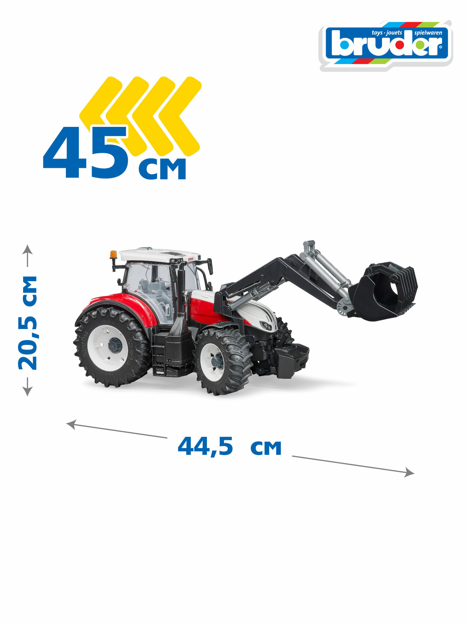 Теперь разыграть в детской комнате стройплощадку или сельхоз работы вашему ребенку не составит труда. Ведь в его распоряжении есть точная копия фермерской техники, которая не только выглядит реалистично, но и дополнена функциональным фронтальным погрузчиком. Реалистичный трактор пополнит коллекцию юных автолюбителей и станет основой для интересной игры, развивающей фантазию и мелкую моторику детей. Изделие выполнено очень правдоподобно и детально, учтены характерные особенности кузова австрийской фермерской техники Steyr 6300 Terrus CVT. Трактором можно управлять с помощью выдвигаемого через крышу руля, а амортизационная ось и гидравлический привод делают этот процесс удобнее. Прорезиненные широкие колеса с рельефными протекторами на корпусе, которые при желании можно снимать, позволяют транспортному средству быстро разгоняться. Детализированный салон трактора можно рассмотреть, открыв передние дверцы игрушки, а откинув капот, дети изучат реалистичный двигатель техники. На корпусе игрушки предусмотрено регулируемое по высоте сцепление для дополнения техники прицепами из серии. А фронтальный погрузчик с поднимающимся и открывающимся ковшом позволит имитировать земляные работы. Чтобы игры с трактором стали еще интереснее, изделие можно дополнить шинами (артикул 03-311) и модулем «свет и звук» (артикул 02-802), которые приобретаются отдельно. Корпус изделия выполнен из высококачественного пластика, который устойчив к ударам и повреждениям. Яркий цвет кузова игрушки надолго сохранит свою насыщенность благодаря используемым при окраске стойким красителям.