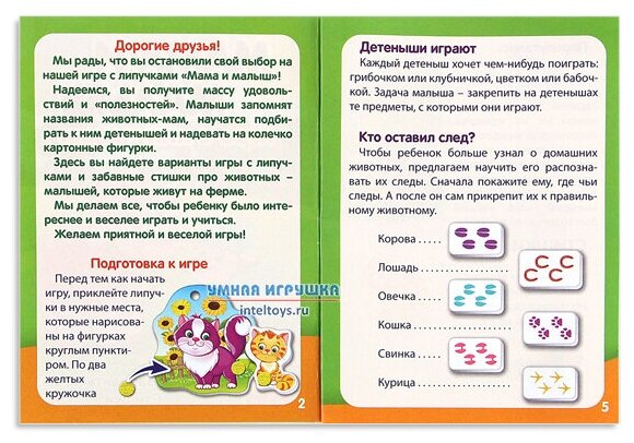 Набор оказался полезным - несколько вариантов игры, в комплекте ест липучки, на каждой картинке отмечено куда их клеить, так же есть колечко - можно собрать любимых зверюшек и брать везде с собой. Так же в комплекте идёт интересная брошюрка с забавными стишками про животных. Любим, играем и Всем советуем.