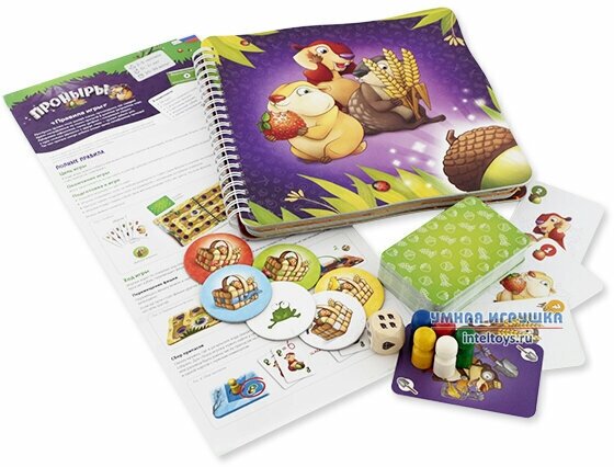 | Состав набора | 58 карт,перелистываемое шестистраничное поле с отверстиями,5 деревянных игровых фишек,5 жетонов-корзин,игральный кубик |