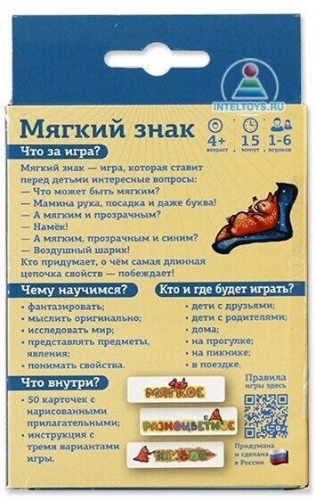 Мягкий знак – замечательная игра для детей и взрослых на фантазию и внимательность к тому, что рядом с нами. Как играть? Очень просто. По очереди открываем карточки, на которых написано какое-то свойство или качество. Придумываем или отыскиваем вокруг себя, что за предмет может обладать этим свойством. Нашли?Тогда открываем следующую карточку и теперь ищем предмет, обладающий двумя свойствами одновременно. Дальше – больше! С каждой новой открытой нами карточкой заданных свойств будет больше и подбор слова – сложнее. Но и интереснее. Фантазия заработает на полную мощность!