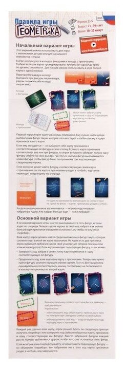 | Комплектация | 32 карты с фигурами, 33 карты с заданиями, 7 экшн-карт, карточка-транспортир, 36 карт с фигурами, 36 карт с заданиями, карточка-транспортир, правила игры |