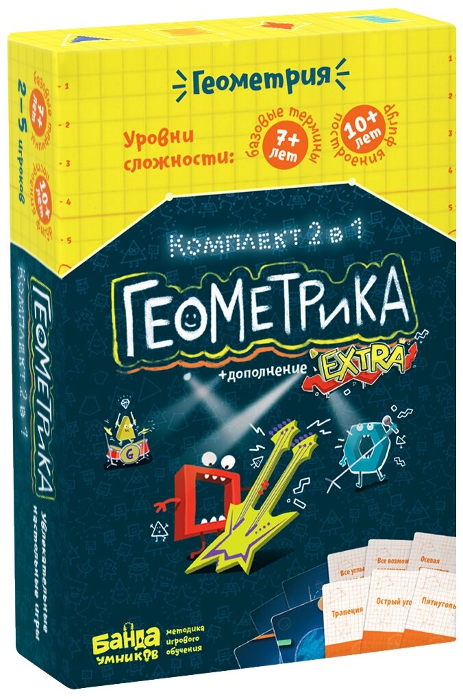 Геометрика и дополнение к ней - Геометрика Extra - в красивой подарочной коробке. После нескольких игр дети без труда будут ориентироваться в геометрических понятиях, находить заданные признаки и сравнивать фигуры. Является ли круг эллипсом? Это один из сотен вопросов, который возникнет по ходу игры, и выяснить который будет очень важно всем участникам. В комплекте Оригинальная Геометрика, базовый комплект. Увлекательная игровая механика в ней сочетается с необходимостью оперировать базовыми геометрическими понятиями: в игре ребёнок естественно и с интересом усваивает названия геометрических фигур и их признаки, математическую терминологию, свойства геометрических объектов. Дополнение Геометрика Extra - набор дополнительных карточек, которые делают игру динамичнее и сложнее, а также позволяют освоить изрядную порцию новых геометрических понятий.