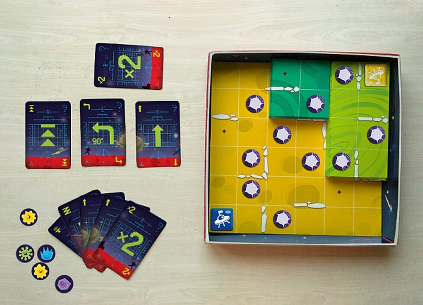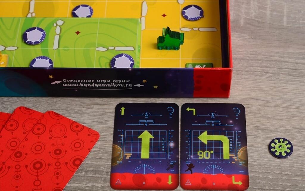 | Комплектация | двустороннее игровое поле, 5 картонных блоков-холмов, 52 карты команд, 4 фигурки вездеходов, 4 жетона баз/лабораторий, 20 жетонов с образцами жизней, 1 жетон для обозначения начала алгоритма, иллюстрированные правила |