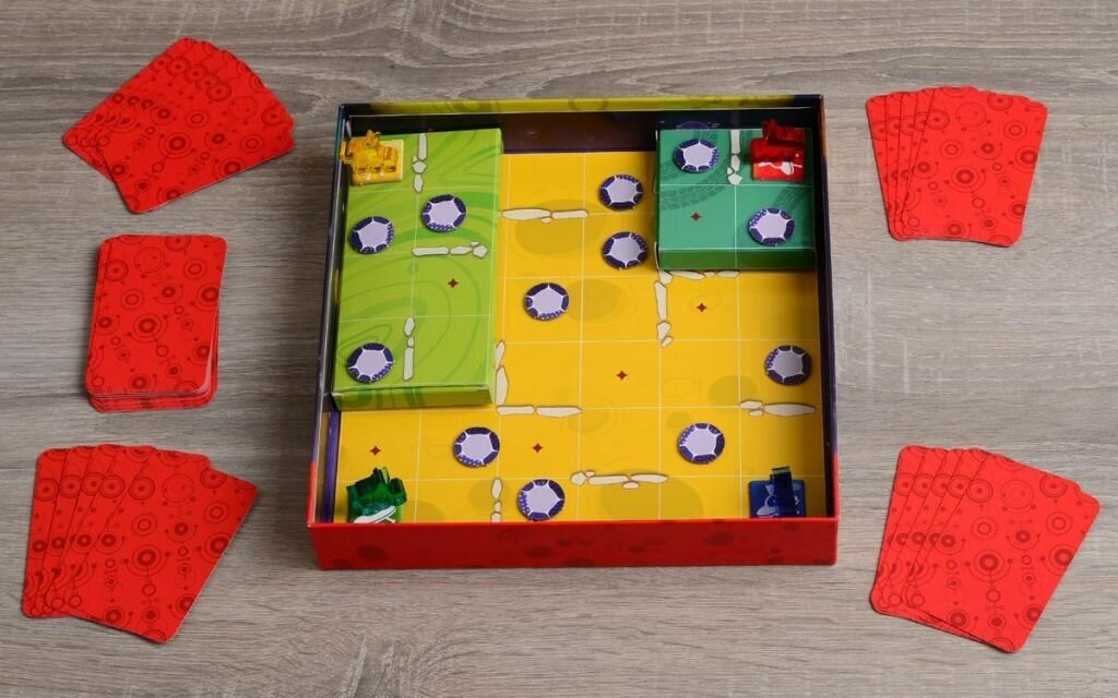 | Состав набора | двустороннее игровое поле,5 картонных блоков-холмов,52 карты команд,4 фигурки вездеходов,4 жетона баз/лабораторий,20 жетонов с образцами жизней,иллюстрированные правила |