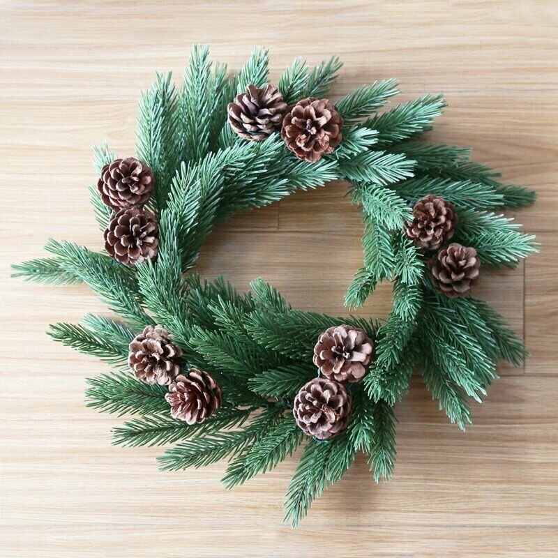 Еловый венок считается традиционным украшением двери. Добрая влагозащищенность разрешает применить венок как жилища , например и на улице. Венок очень хорошо подойдет для декорации как жилплощади , кабинета , например и дачного жилища .Этот венок содержит поперечник 45 см, исполнен из литового пластика, в качестве вспомогательного декора содержит шишки.