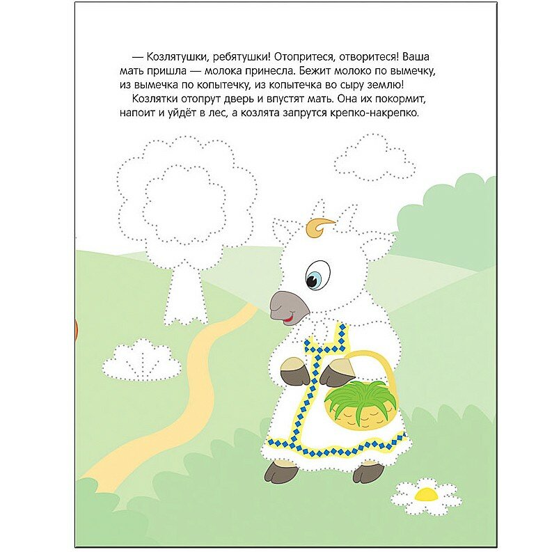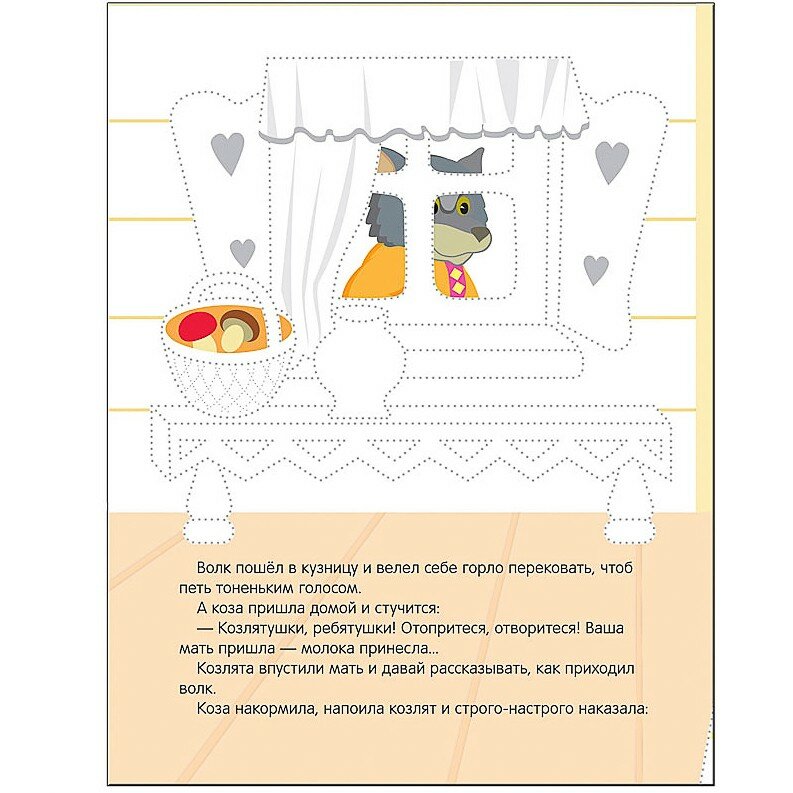 С книжкой Волк и козлята серии Рисуем по точкам Ваш ребенок почувствует себя настоящим художником. Ему предстоит создать красочные иллюстрации к любимой русской народной сказке. Для этого малышу нужно лишь аккуратно обвести пунктирные контуры, а затем раскрасить получившиеся картинки с помощью карандашей или фломастеров. Рисование по точкам–занятие не только увлекательное, но и полезное. Оно способствует развитию графических способностей, мелкой моторики, зрительного восприятия и пространственного мышления, что в дальнейшем поможет ребенку в обучении письму и формировании красивого почерка.