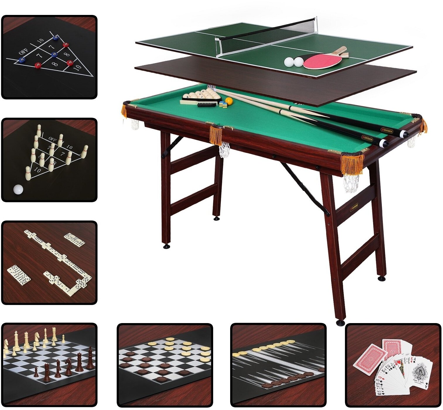Бильярдный стол Fortuna Русская пирамида 4 фута 9 в 1 - это многофункциональный игровой стол, включающий 9 игр: русский бильярд, шашки, шахматы, нарды, настольный теннис (пинг-понг), кегли, шаффлборд, игральные карты и домино. Основой служит бильярдный стол размером 4 фута для игры в русскую пирамиду с плитой из ЛДСП толщиной 12 мм, покрытой сукном традиционного для бильярда цвета English Green (английский зеленый). Для игры в настольный теннис поверх стола накладывается игровое поле для тенниса (толщина плиты 9 мм) и устанавливается сетка. Для использования стола в качестве основы для других видов игр используется другая дополнительная плита толщиной 3 мм черного цвета, на которой размещается игровое поле с разметкой для соответствующей настольной игры (шашки, нарды, шахматы, шаффлборд или кегли) либо эта плита используется как самостоятельная игровая поверхность (игральные карты, домино).