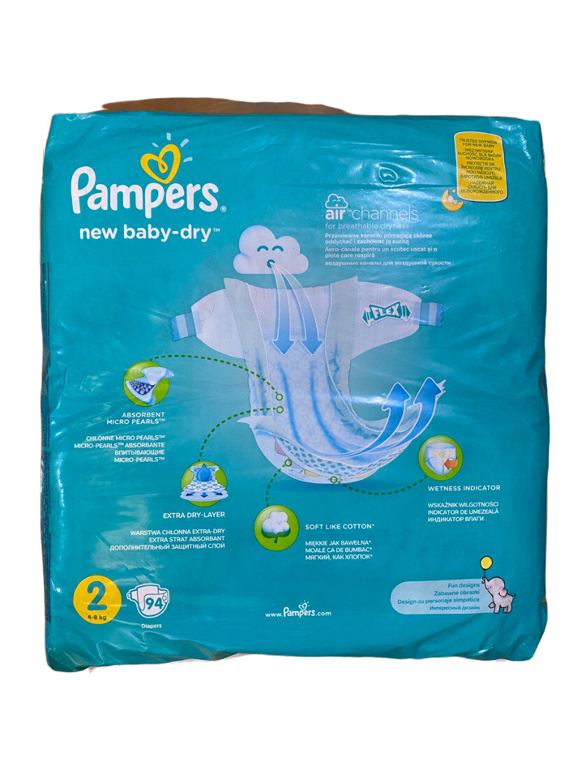 Подгузники Pampers New Baby-Dry 4–8 кг, размер 2, 94 штук. Подгузники Pampers New Baby-Dry с воздушными каналами подарят сухость на всю ночь коже новорожденного малыша. Циркуляция воздуха внутри подгузника позволяет коже оставаться сухой и дышать, а дополнительный слой помогает равномерно распределять влагу внутри подгузника .