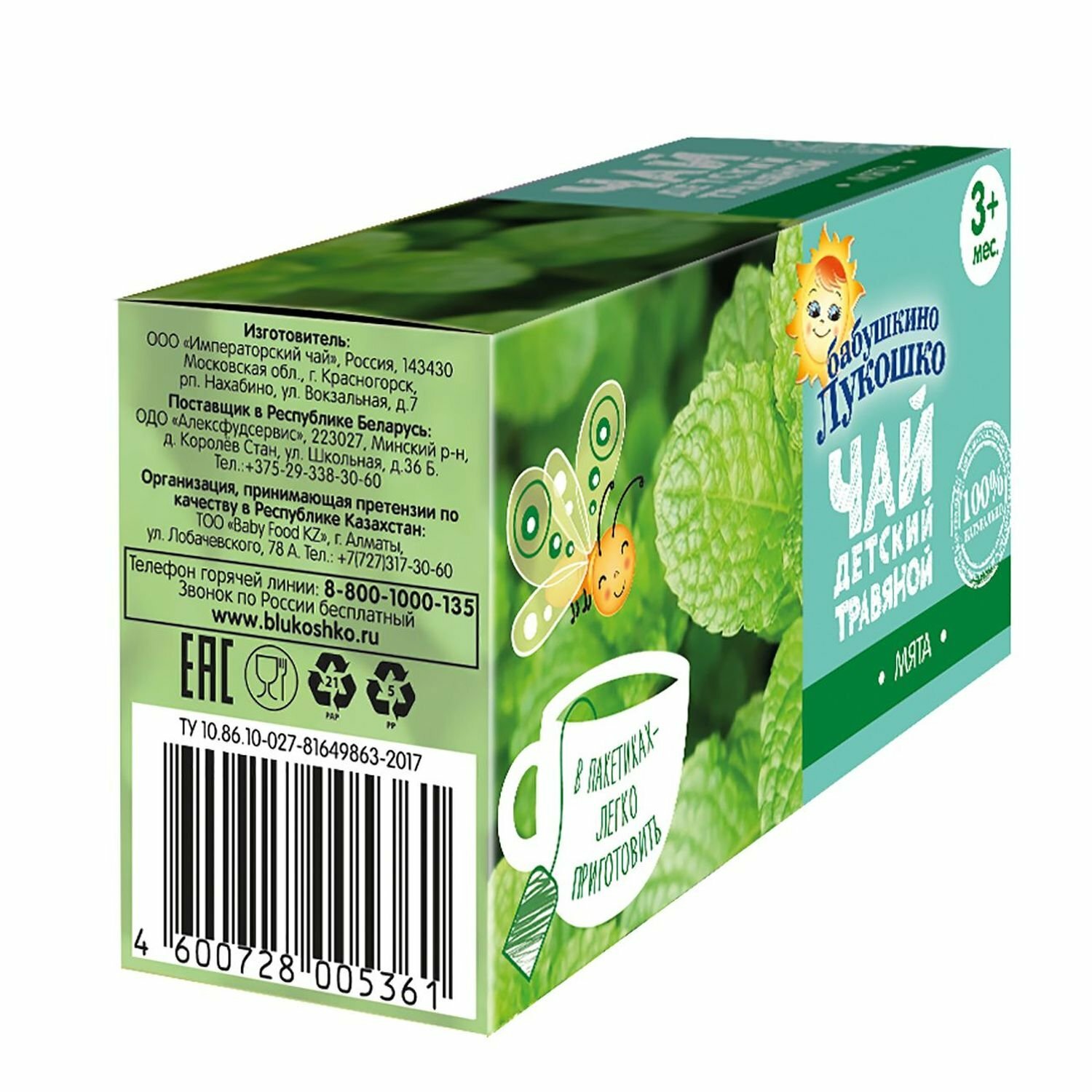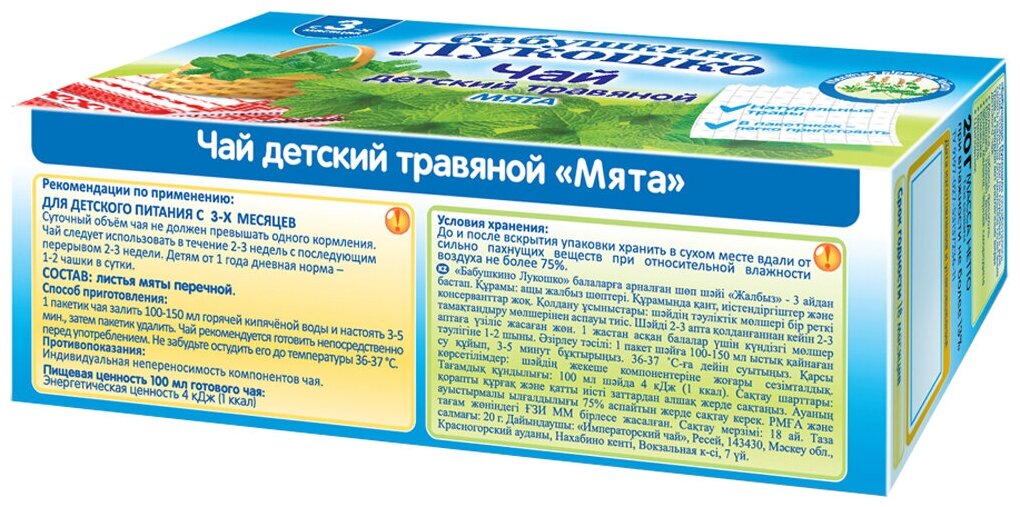 Чай Бабушкино Лукошко мята подойдет для малышей с 3 месяцев. Листья мяты перечной богаты эфирными маслами и витамином С. Перечная мята оказывает противовоспалительное, обезболивающее и спазмолитическое действие. Мята также используется как легкое успокаивающее средство при беспокойстве и повышенной возбудимости детей.