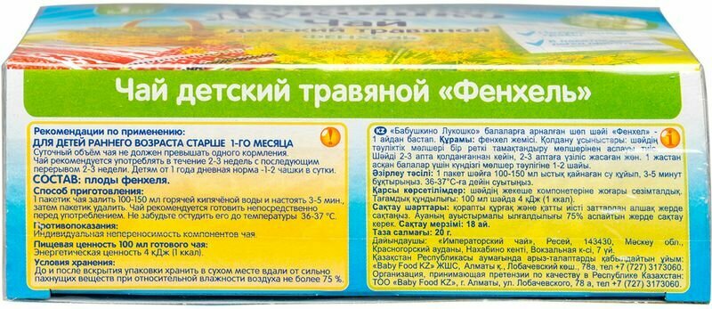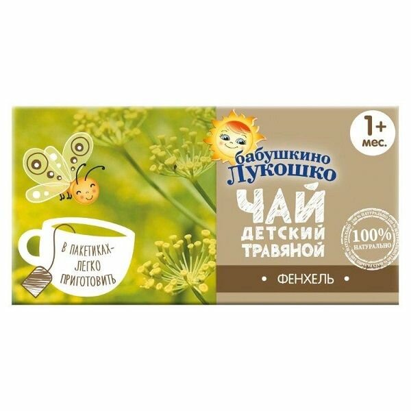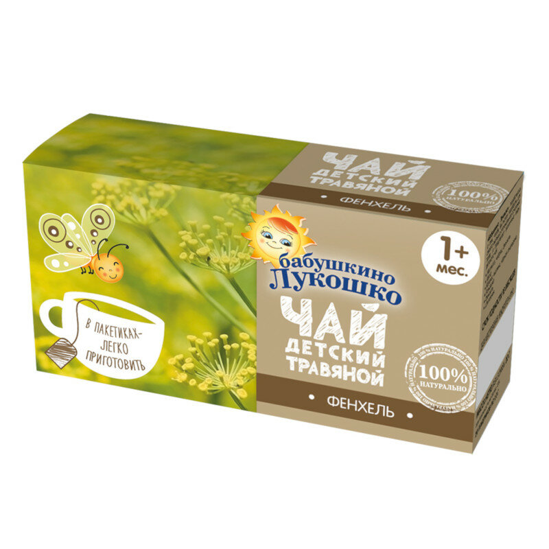 Чай Бабушкино Лукошко фенхель подойдет для малышей с 1 месяца. Фенхель, за счет входящего в его состав анетола, снимает спазмы (расслабляет мышцы кишечника). Используется в лечении и профилактике колик, срыгивания и метеоризма у детей.