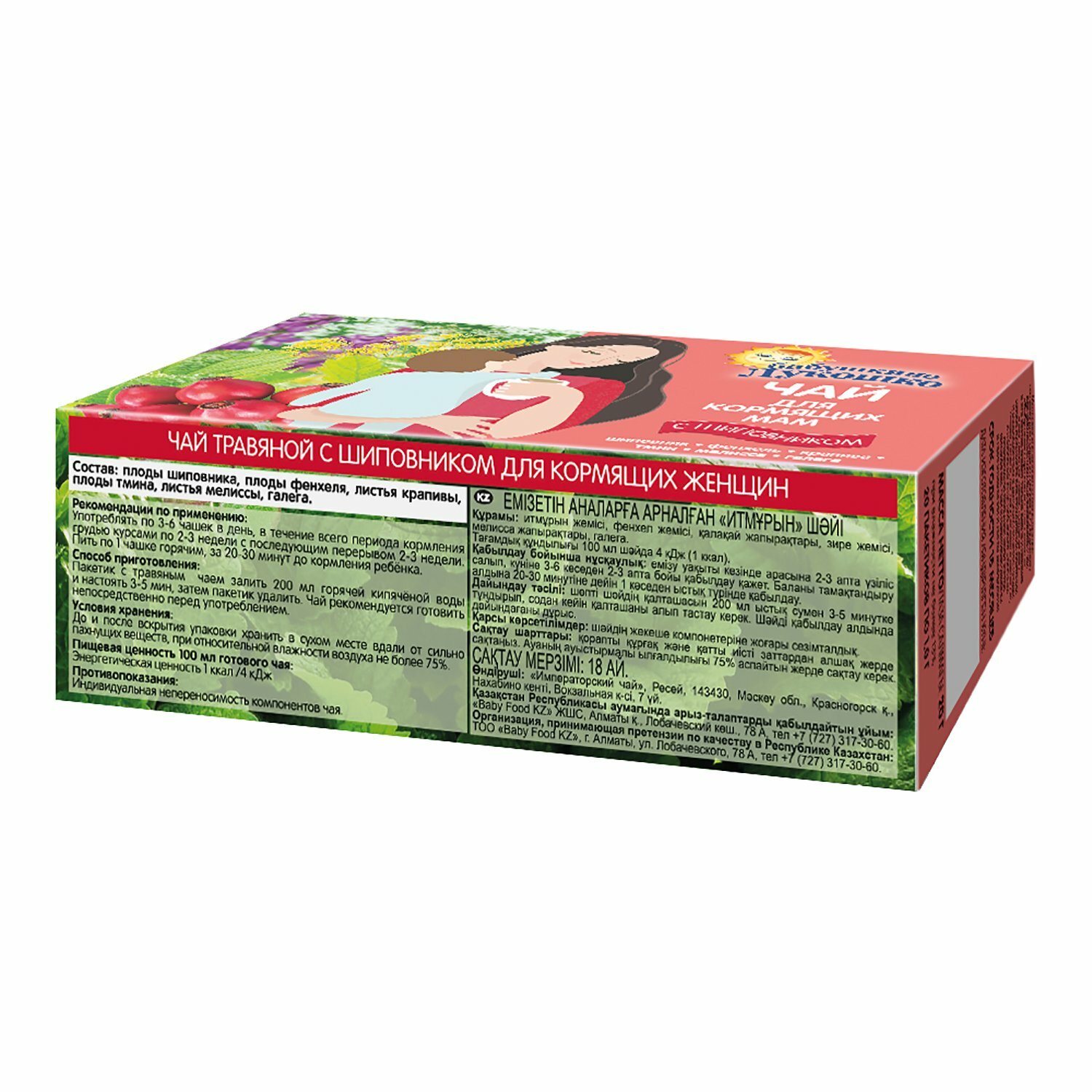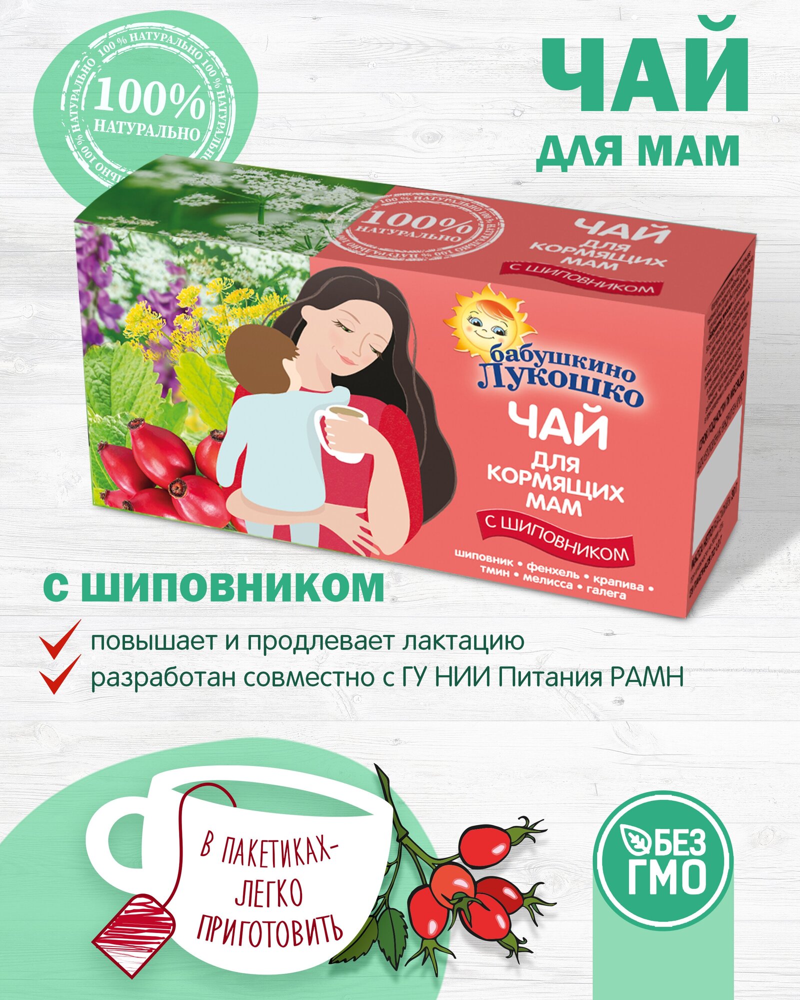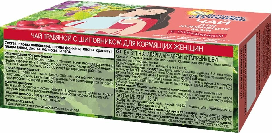 Чай для кормящих мам Бабушкино Лукошко не содержат сахара и декстринмальтозы. Шиповник - источник витаминов и минералов, тмин - обладает спазмолитическим и лактогонным действием. Особое сочетание трав в составе чая стимулирует лактацию, а включение в состав аниса и фенхеля способствует профилактике развития колик и метеоризма у детей.