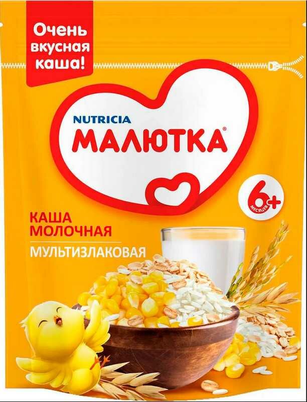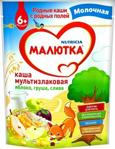 Каша Малютка® мультизлаковая молочная со смесью фруктов для питания детей с 6 месяцев согласно законодательству РФ.