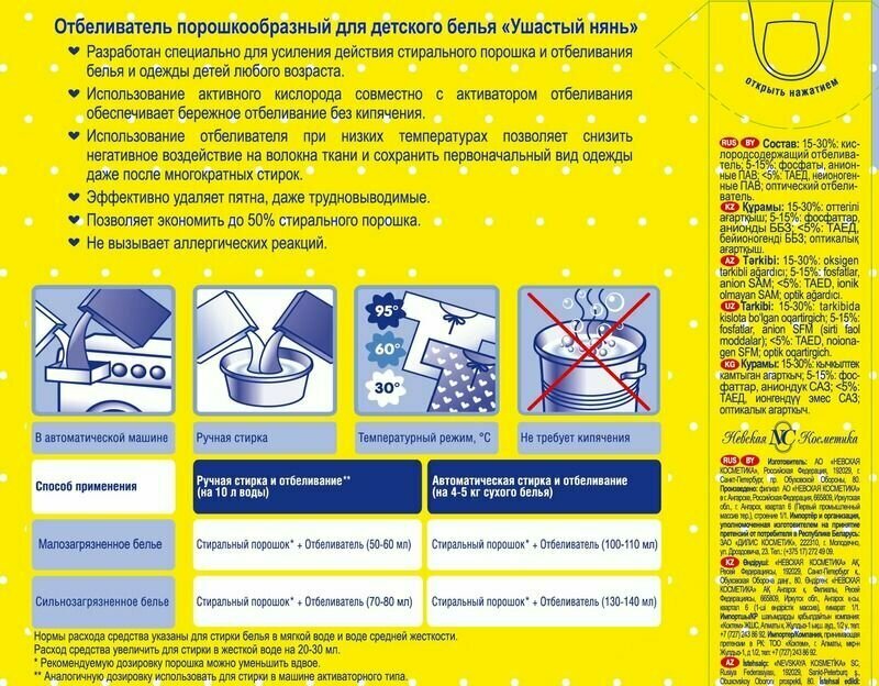 - Разработан специально для усиления действия стирального порошка и отбеливания одежды детей любого возраста, в том числе новорожденных